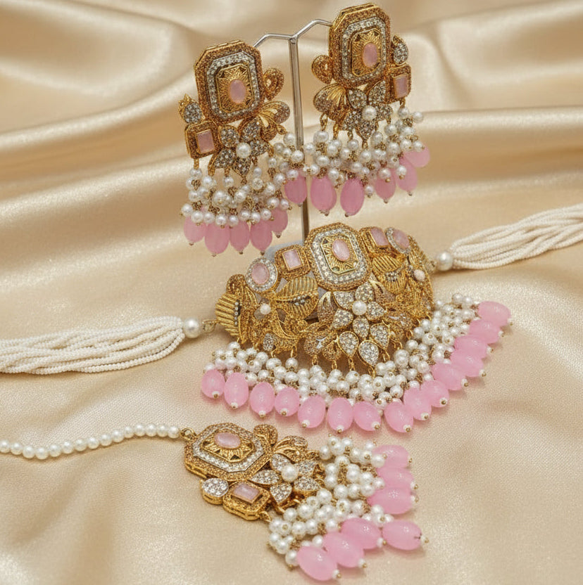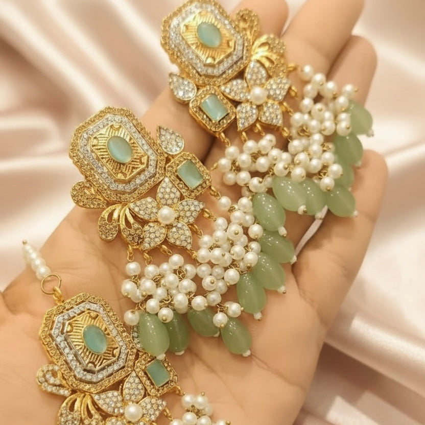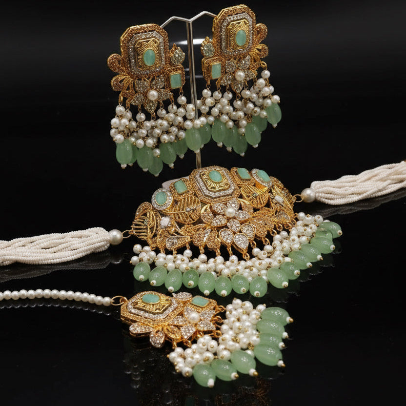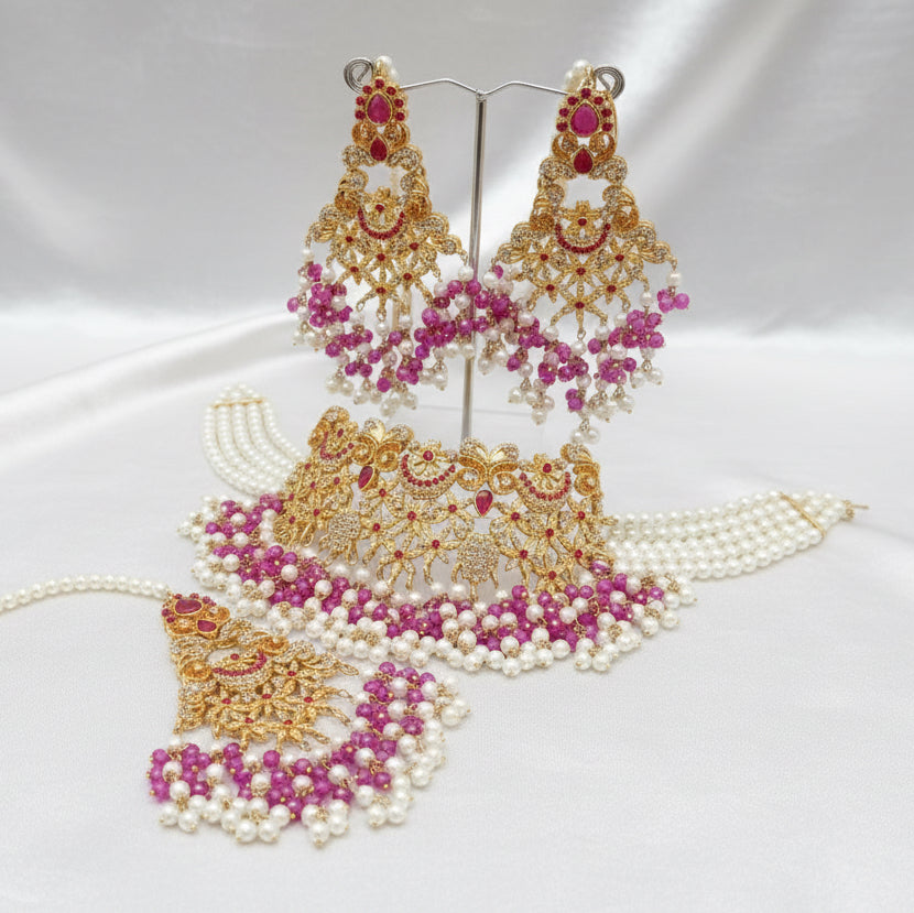 This Hira set is a stunning Pakistani double layered necklace set. It includes a beautiful tikka and Jhumka earrings, perfect for adding a touch of elegance to any outfit.