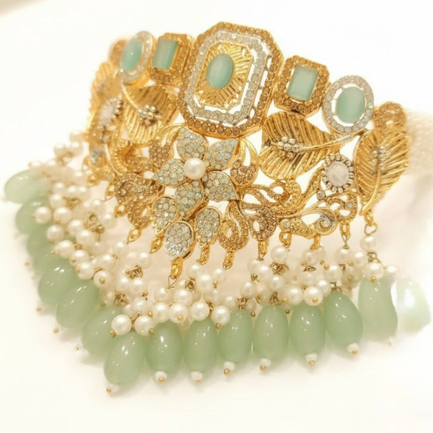 Indulge in luxury with the Sultana Set. This exquisite set features a White beaded necklace, adorned with a mesmerizing Bindiya design and paired with elegant gold-plated earrings.