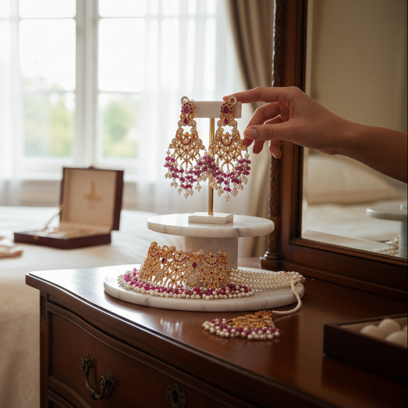 Get ready to make a statement with our Meeral Choker Set! This limited style set is perfect for anyone looking to add a bold desi touch to their outfit. Complete with a choker, earrings, and tikka.
