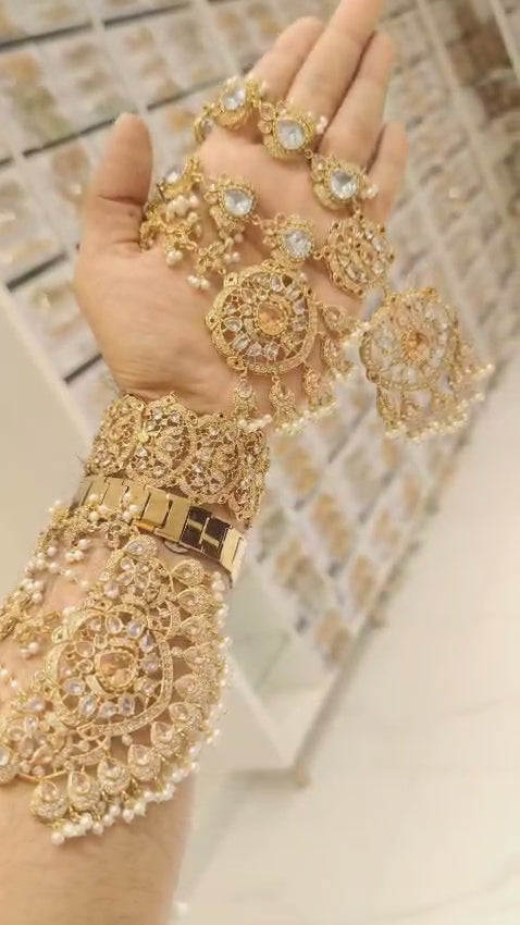 Indulge in luxury with our Nau-Aroos set, a stunning kundan jadau gold plated bridal kit. The set includes exquisite Sahara Jhumki Earrings, a heavy choker, a long mala style necklace, an adjustable ring, and a matching kada (bangle) along with Jhommar/passa and head Tikka. Elevate your bridal look with this high-quality, one-of-a-kind set.