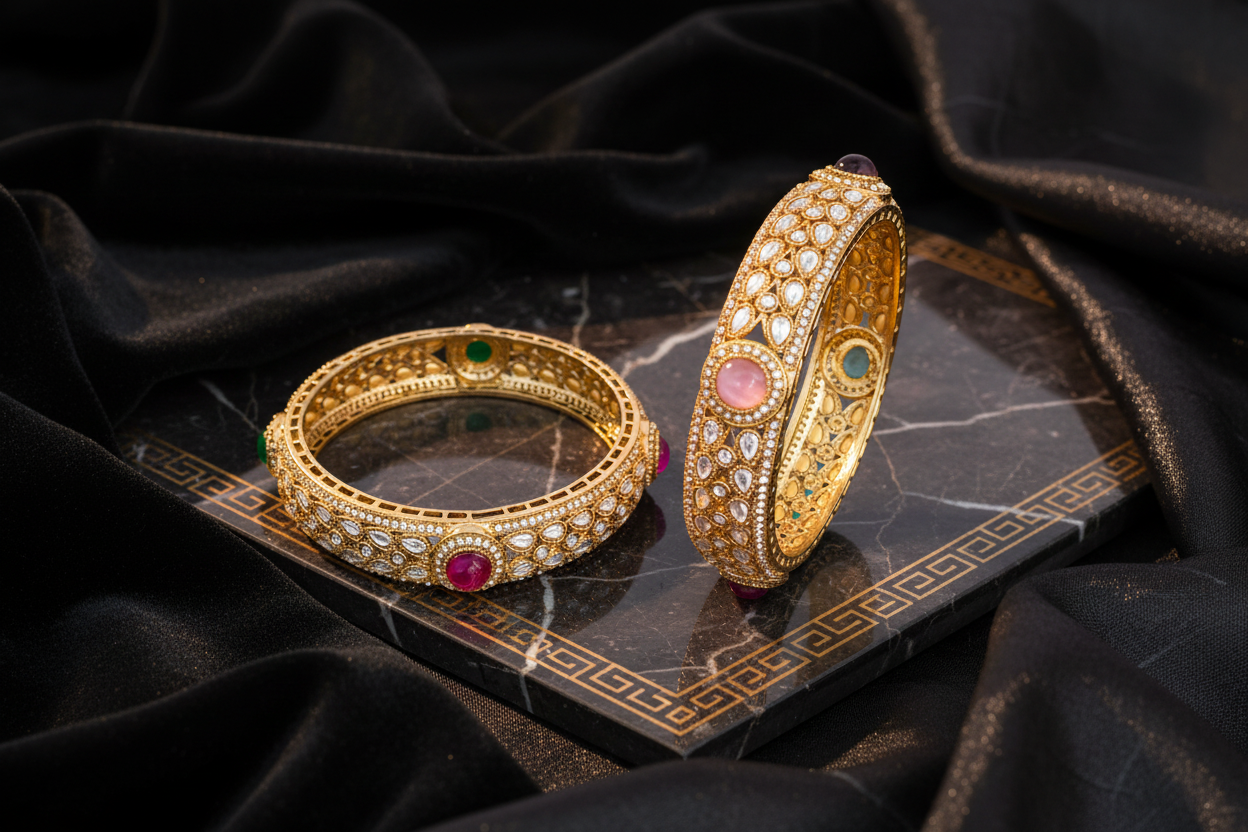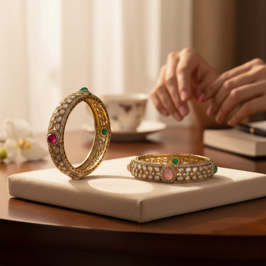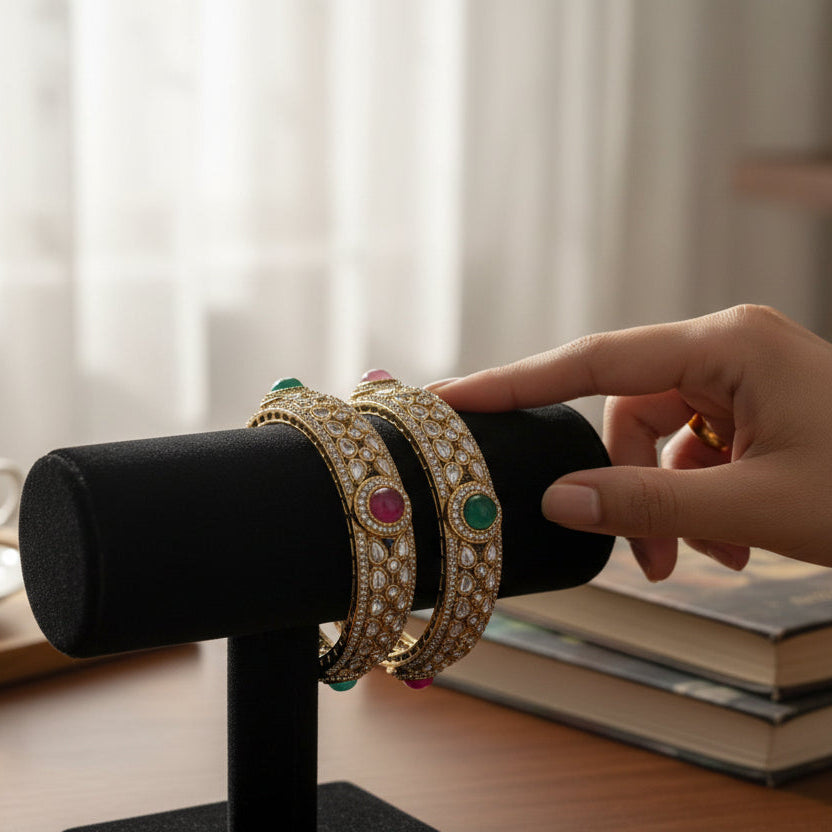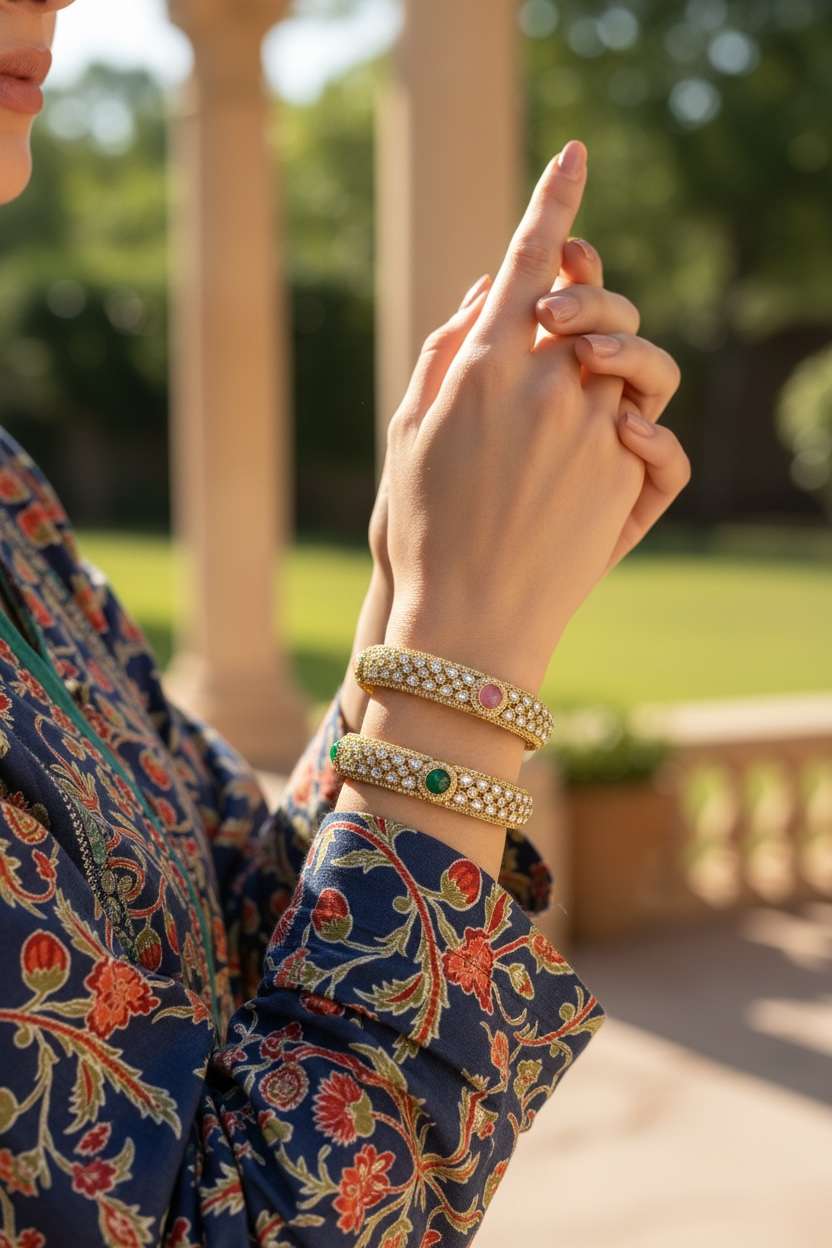 Expertly crafted with tarnish-free mehndi plating, our Dilara Bangles showcase a stunning multitone Bangles design. Combining high-quality materials with intricate detailing.