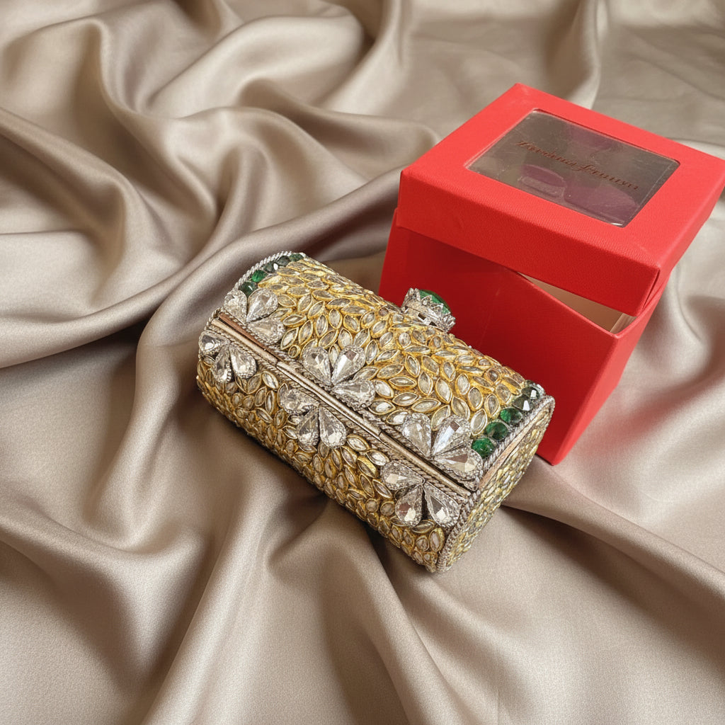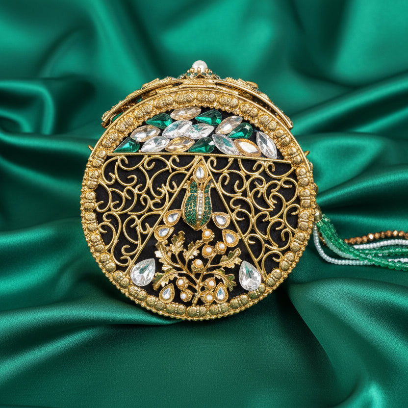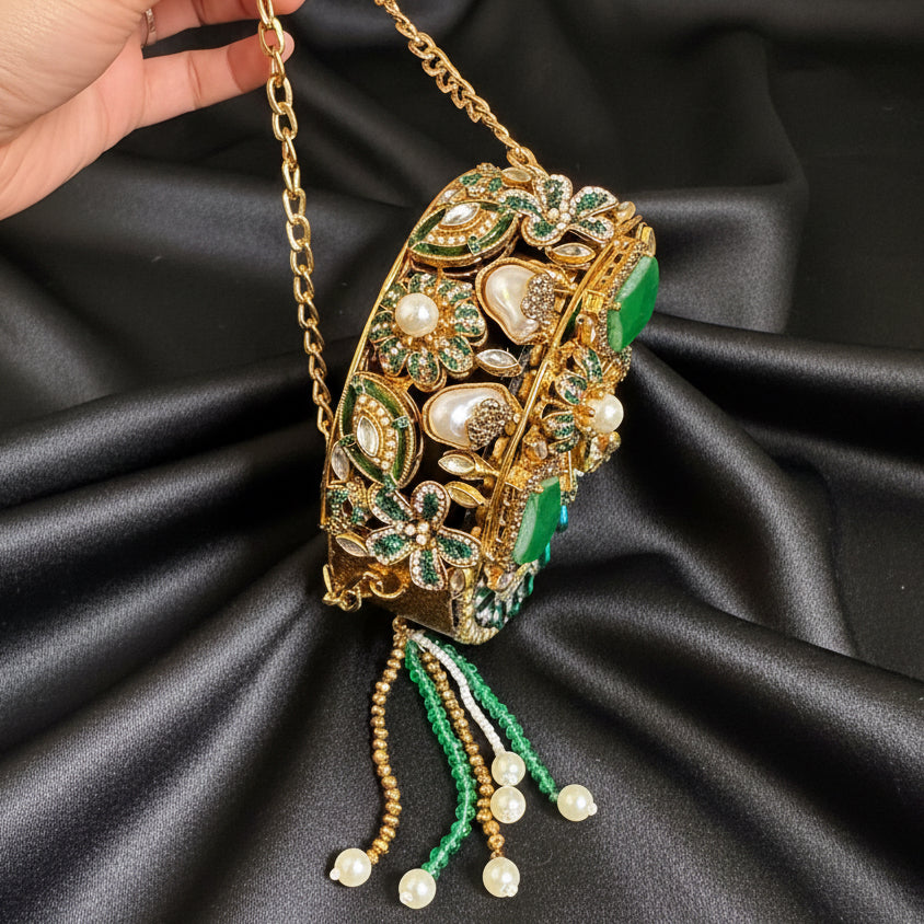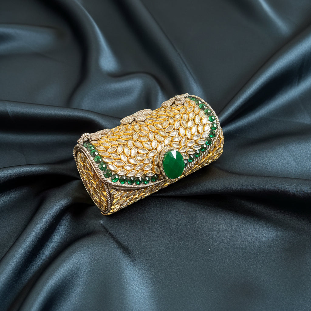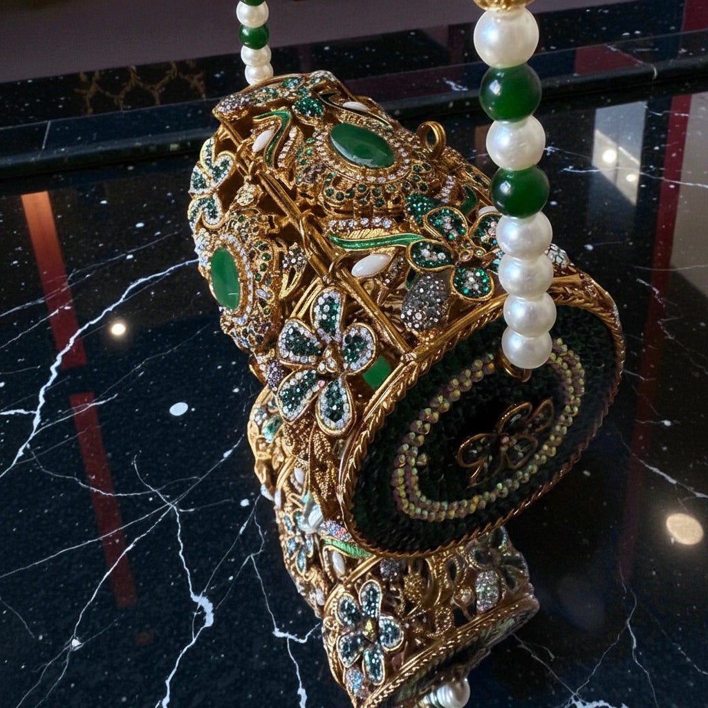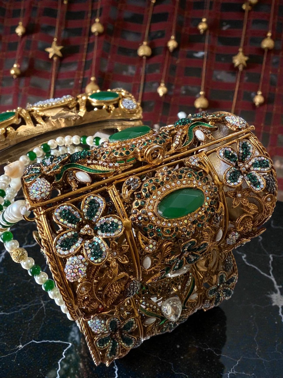 Introducing Palais-Vert The Green Palace 🏰, a stunning Turkish style two sided metal clutch. Adorned with beautiful green stones and elegant golden and roasted gold detailing, this is a must-have accessory for any formal occasion. Make a statement and elevate your style with Palais-Vert.