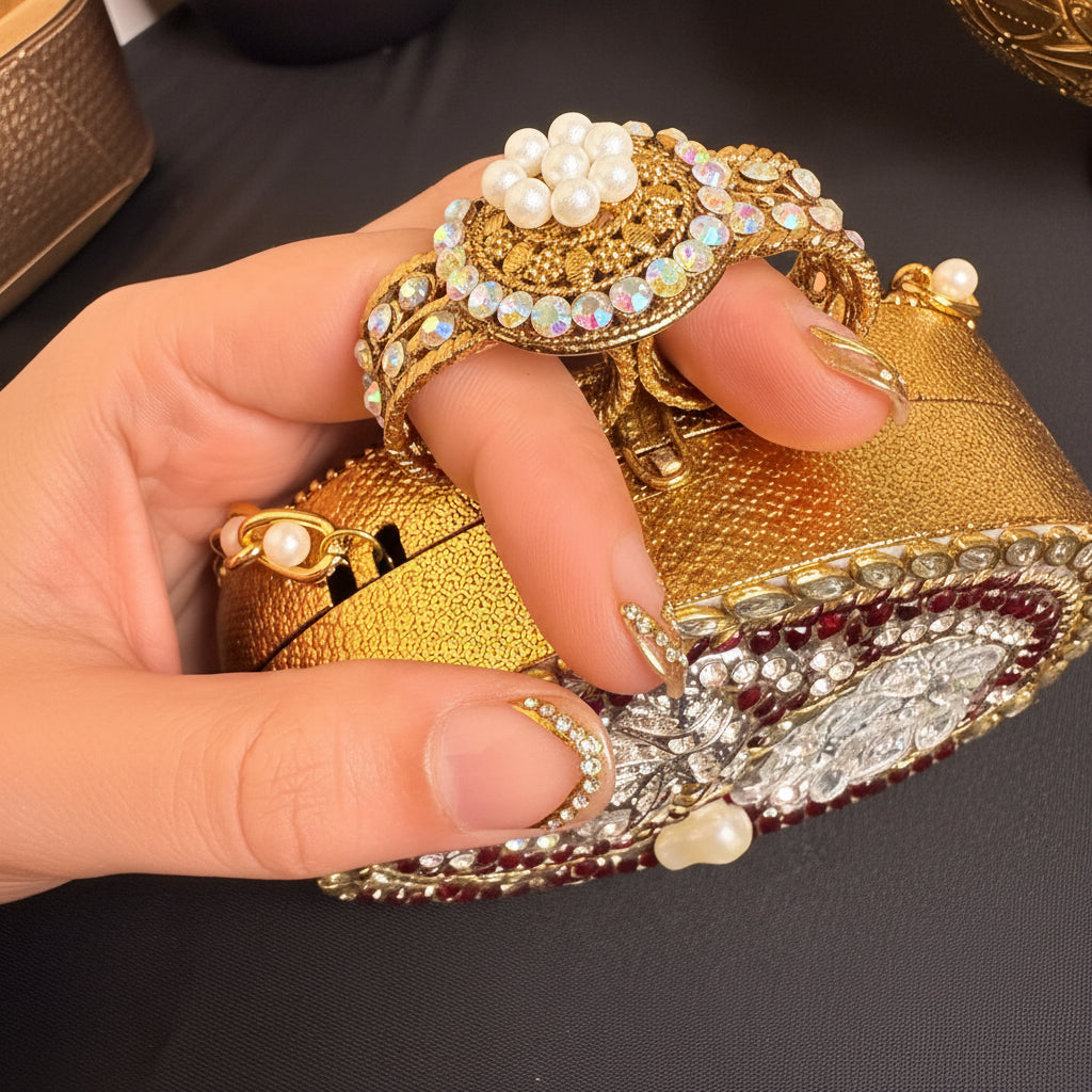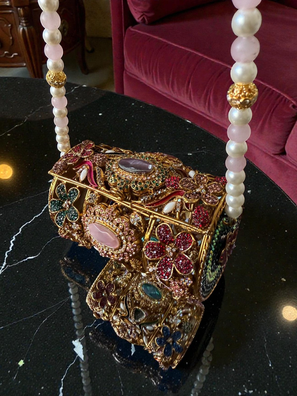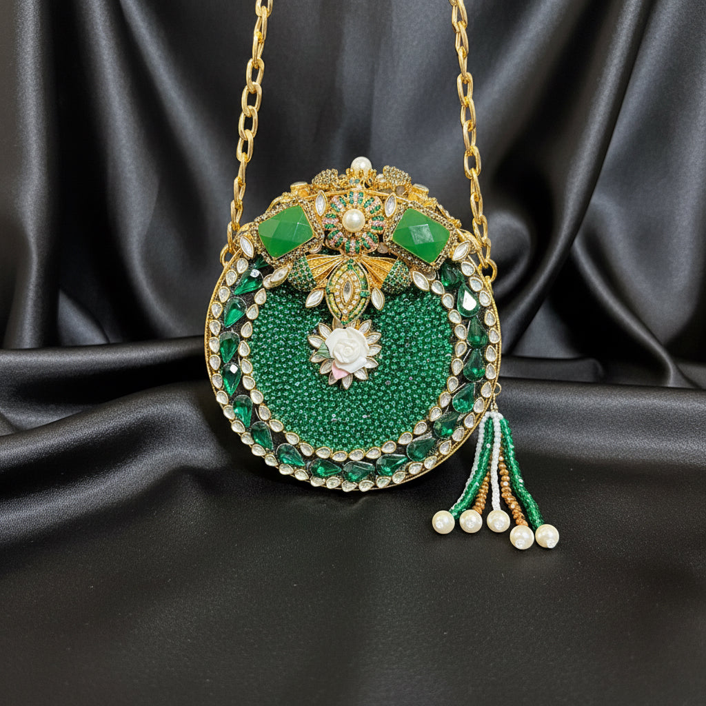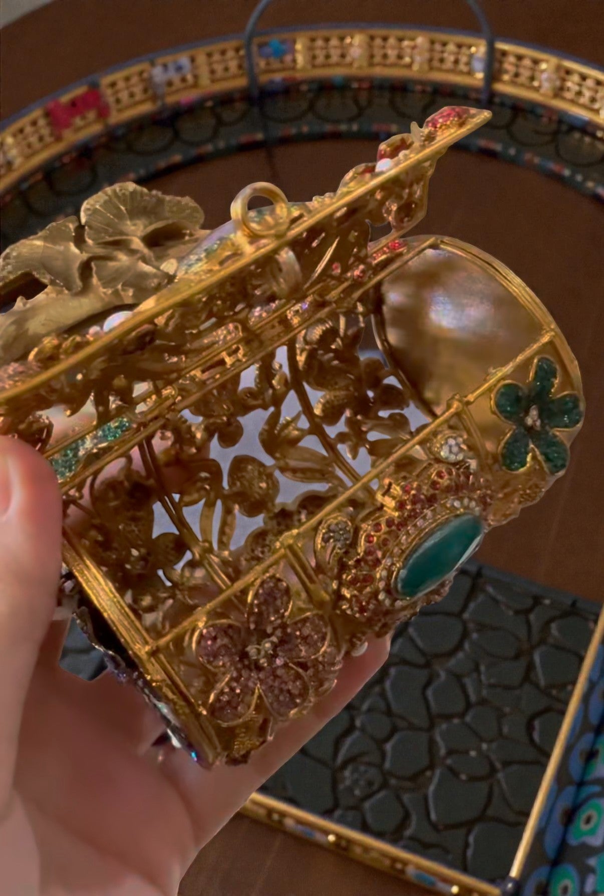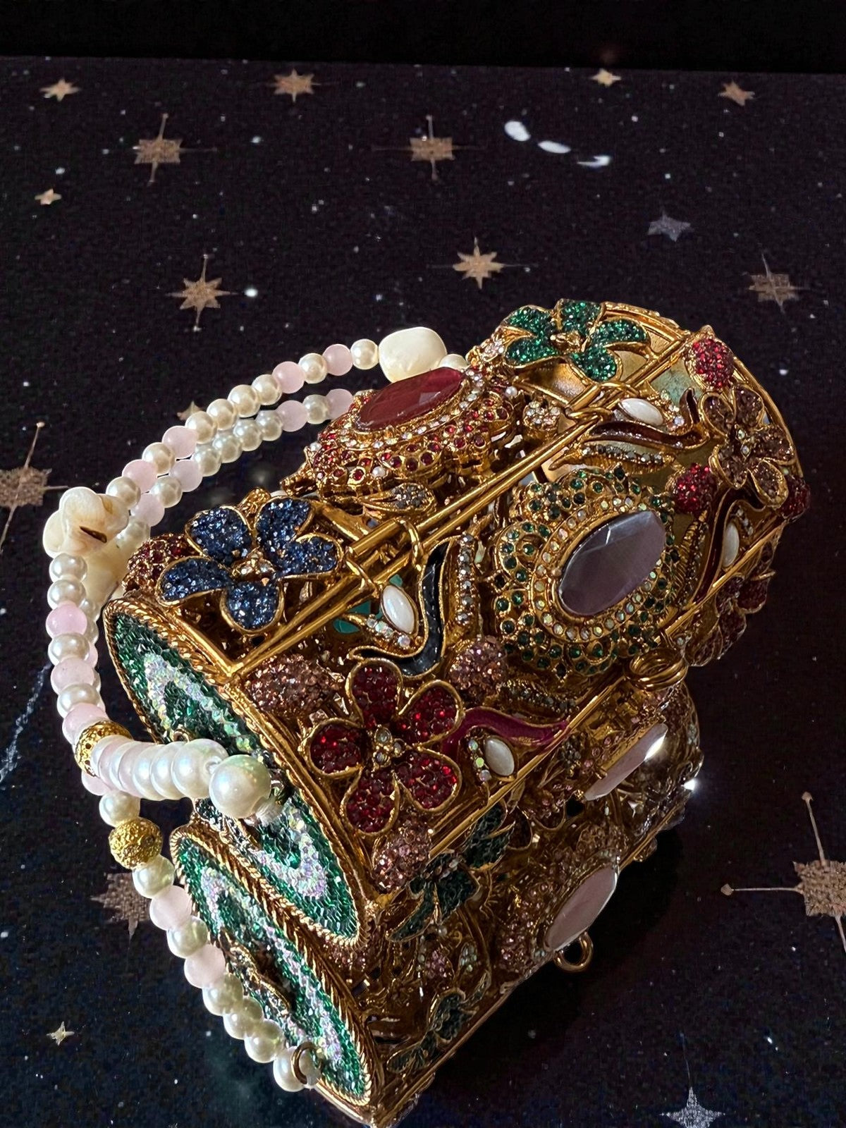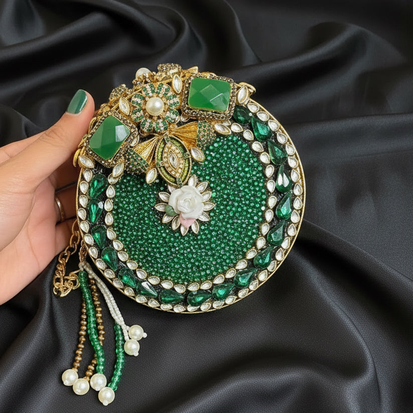 Introducing Palais-Vert The Green Palace 🏰, a stunning Turkish style two sided metal clutch. Adorned with beautiful green stones and elegant golden and roasted gold detailing, this is a must-have accessory for any formal occasion. Make a statement and elevate your style with Palais-Vert.