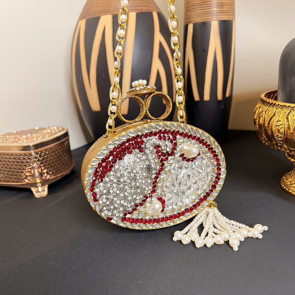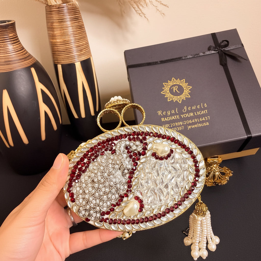 Experience luxury and royalty with La Pochette Maharani- The Queen's Clutch. Admire the stunning peacock design on the front, while the back showcases intricate Spanish Turkish accents. Make heads turn with this exquisite accessory.