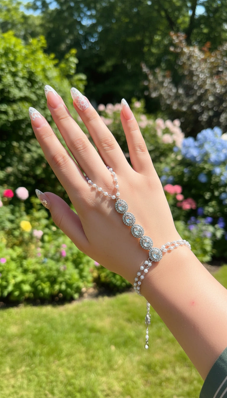 Adorn your hand with the elegance of the Diana hand chain. Made with sparkling cubic zirconia crystals and plated in sleek rhodium silver, this hand bracelet exudes luxury and sophistication.