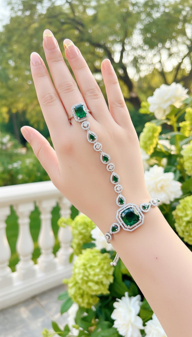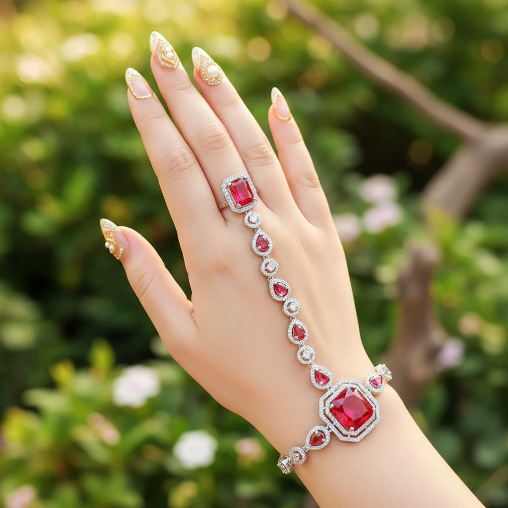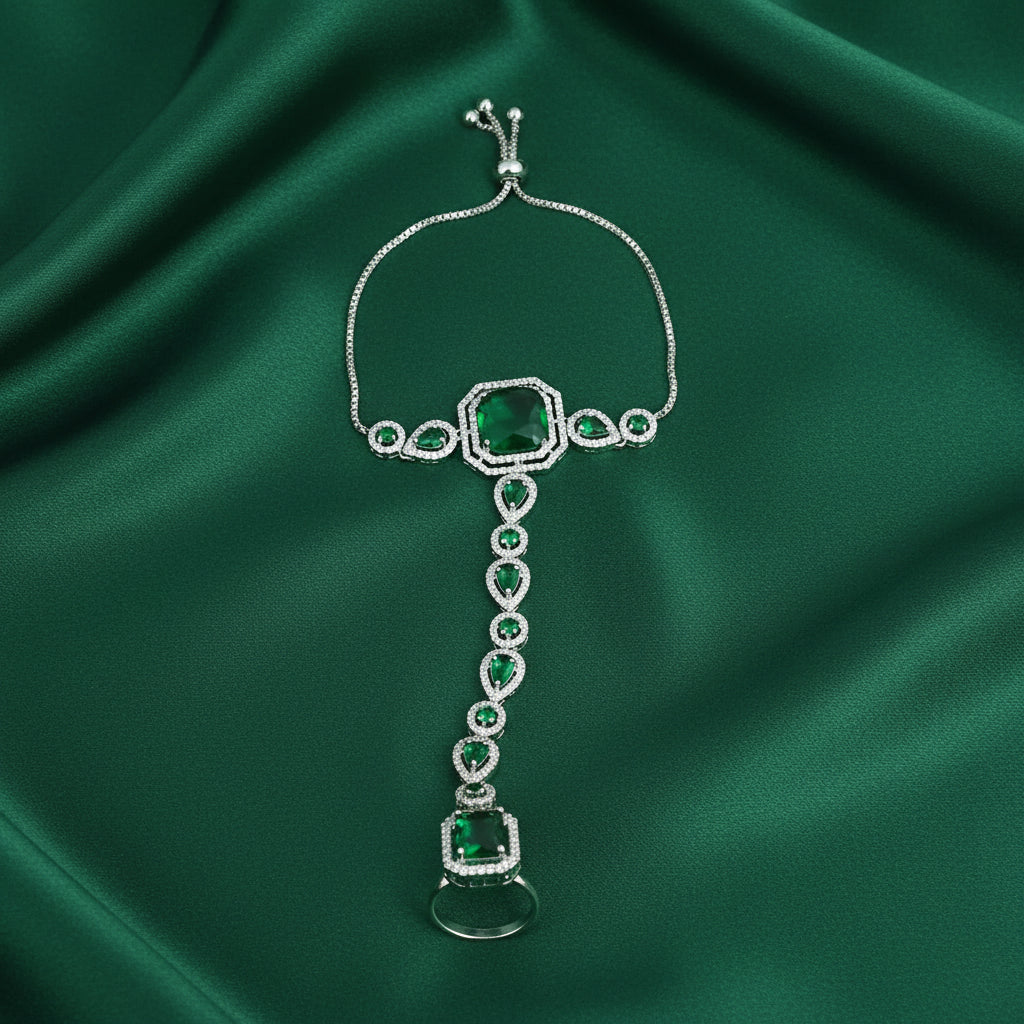 Create a stunning statement with our Meera Hand Chain. This hand chain features a sparkling cubic zirconia rhodium plating and is available in both ruby red and emerald green colors.