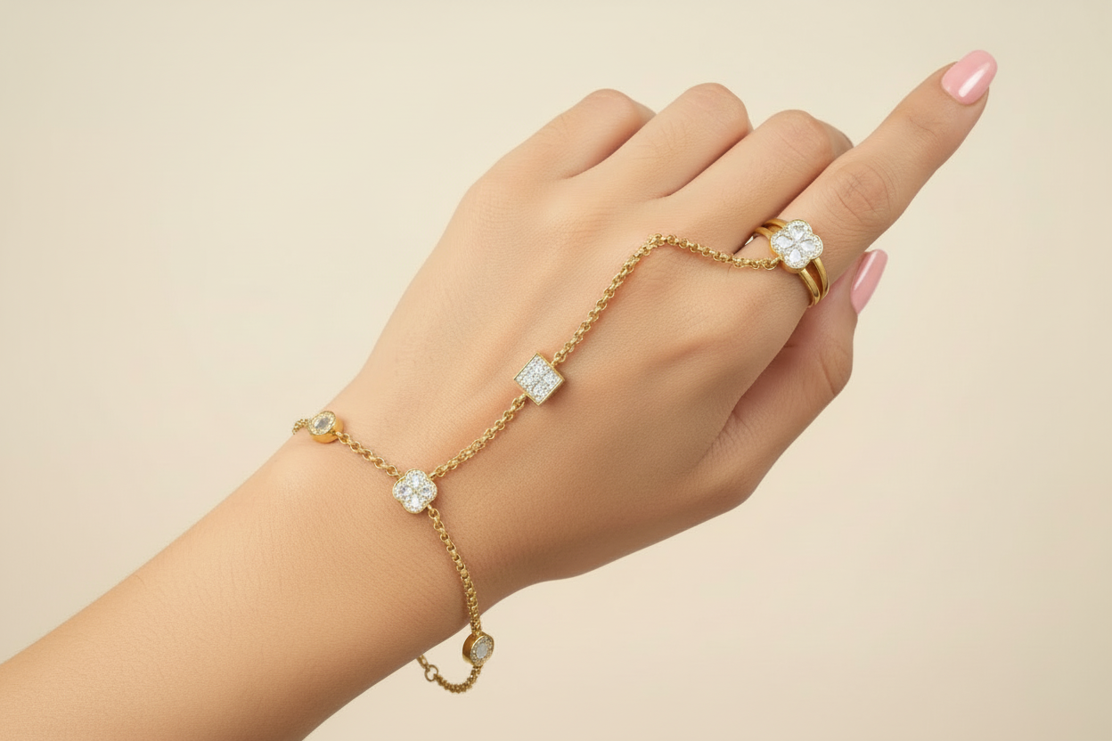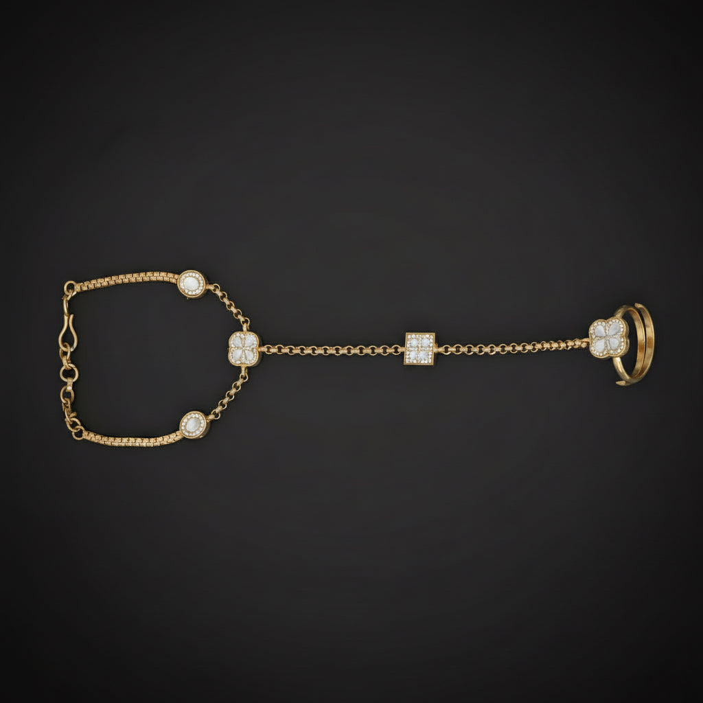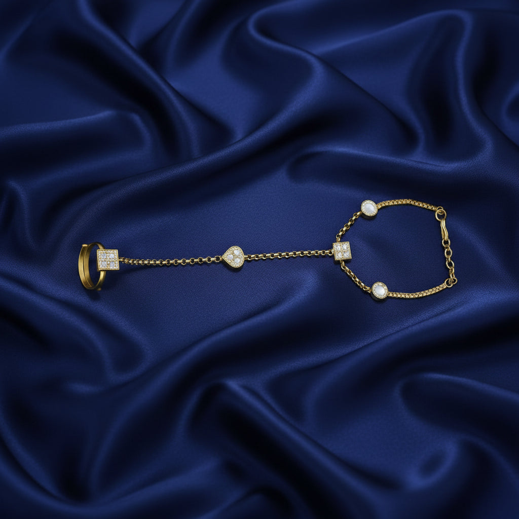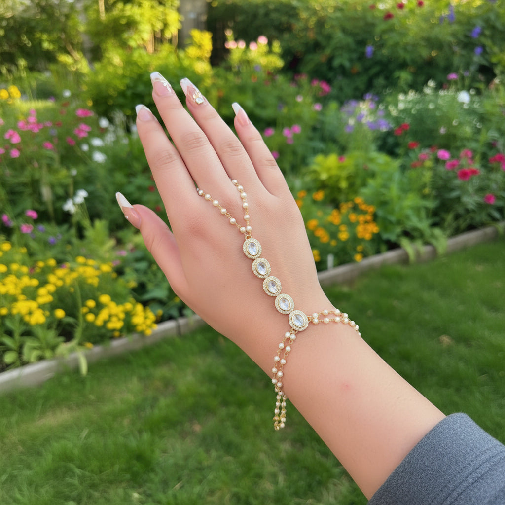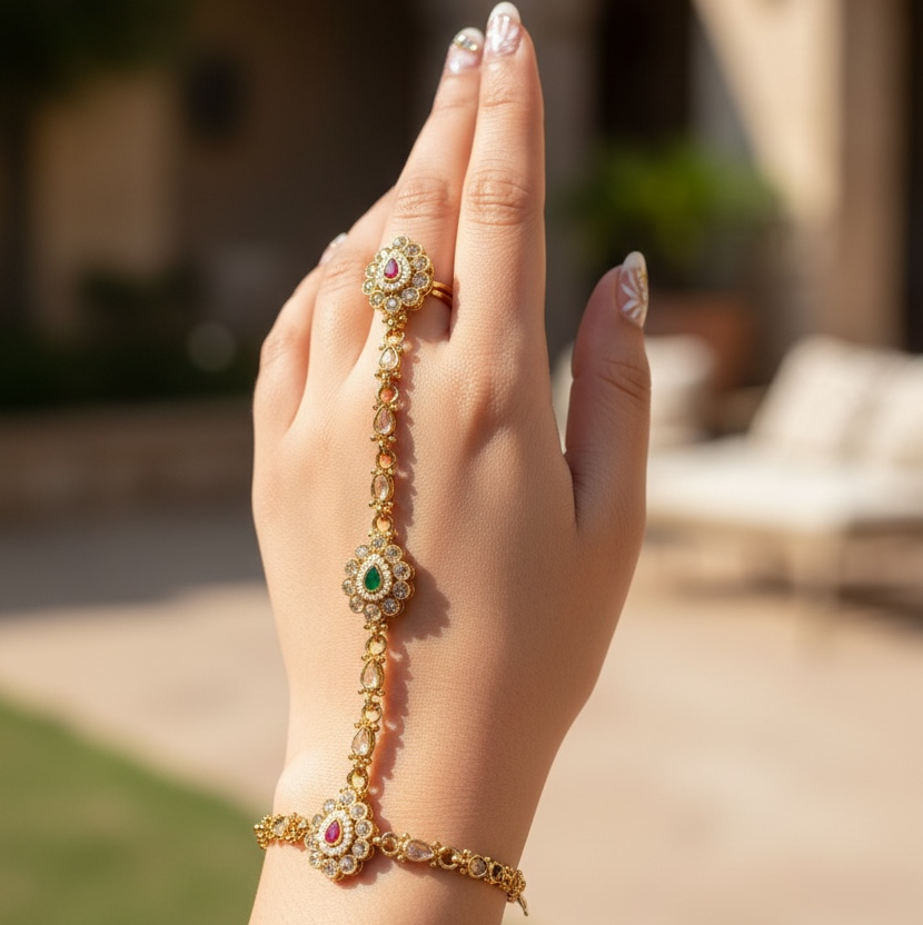 This antique classic hath pan (hand chain bracelet) is a must-have for any jewelry collection. With its elegant gold plating and adjustable ring, it adds a touch of sophistication to any outfit.