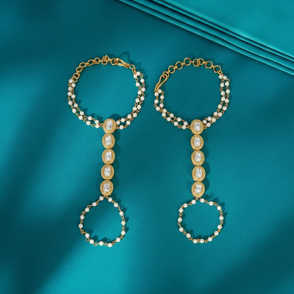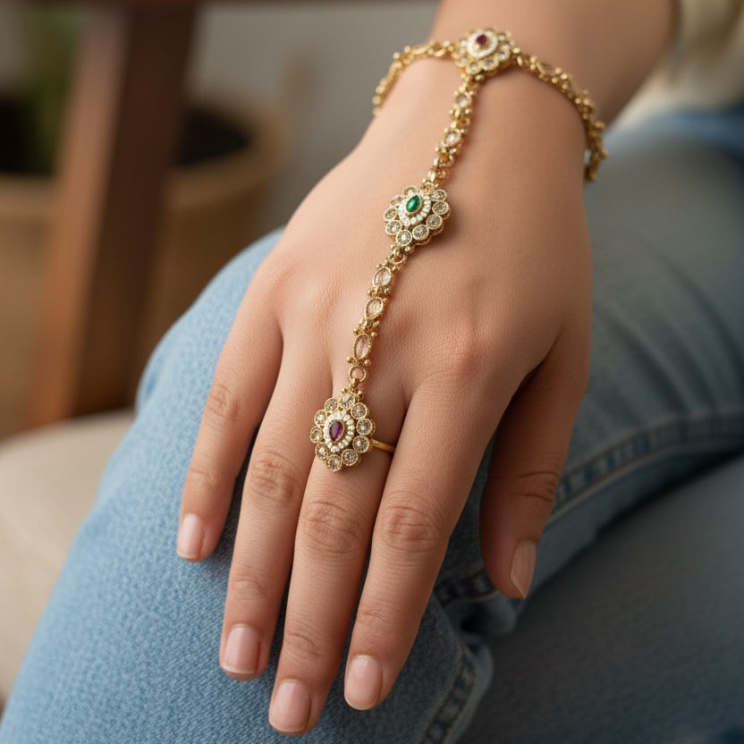 This antique style classic Arohi hath pan (hand chain bracelet) is a must-have for any jewelry collection. With its elegant gold plating and adjustable ring, it adds a touch of sophistication to any outfit.
