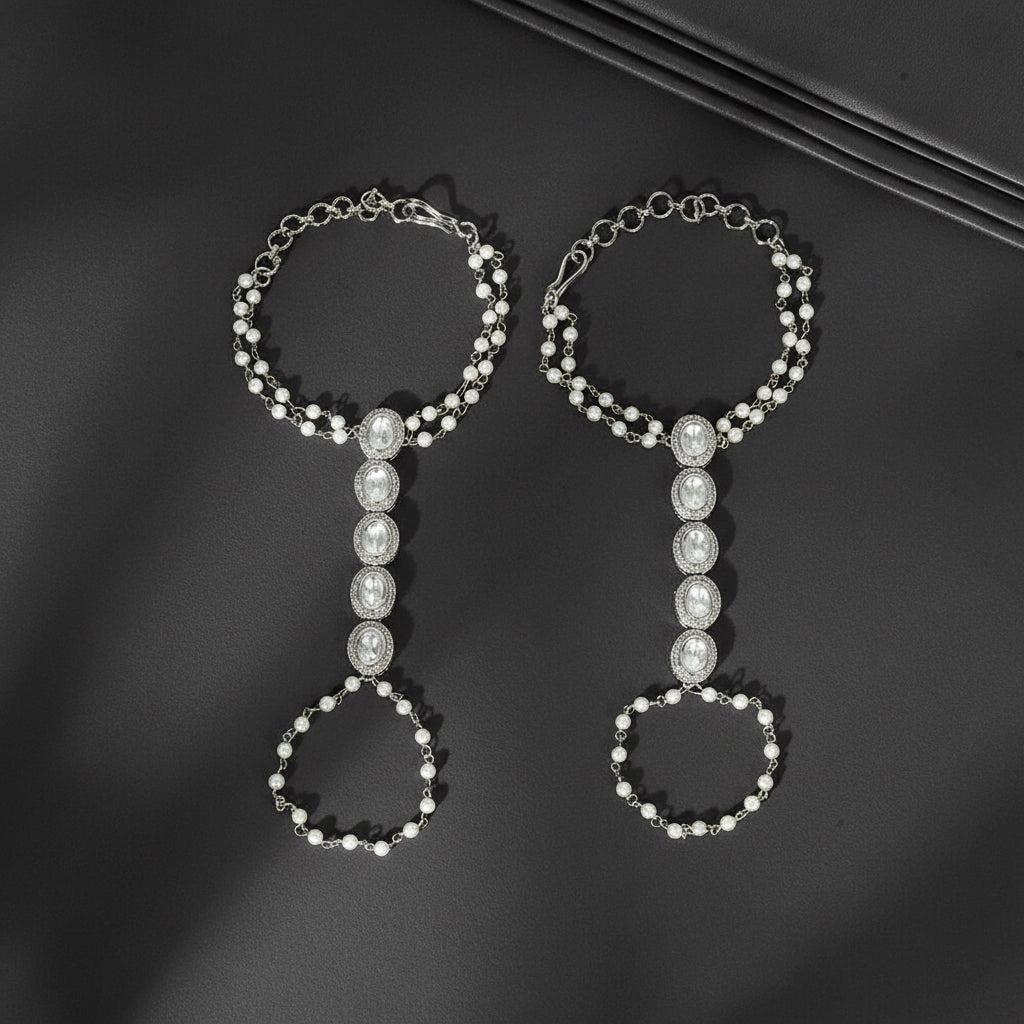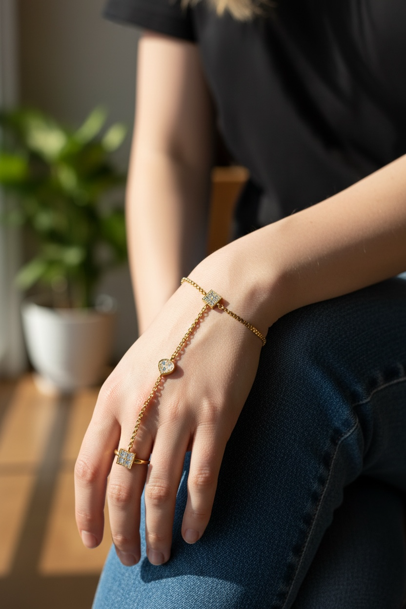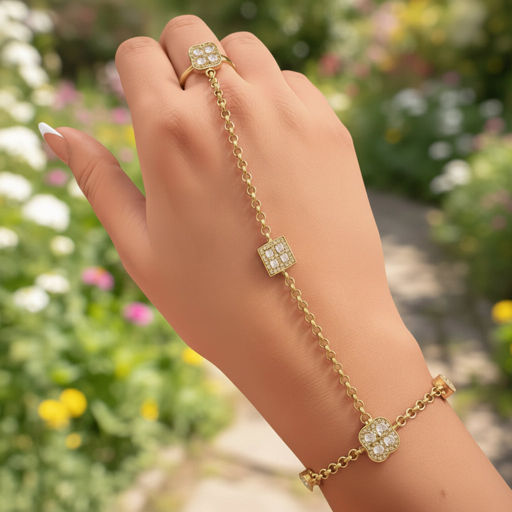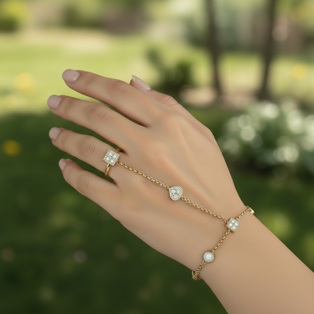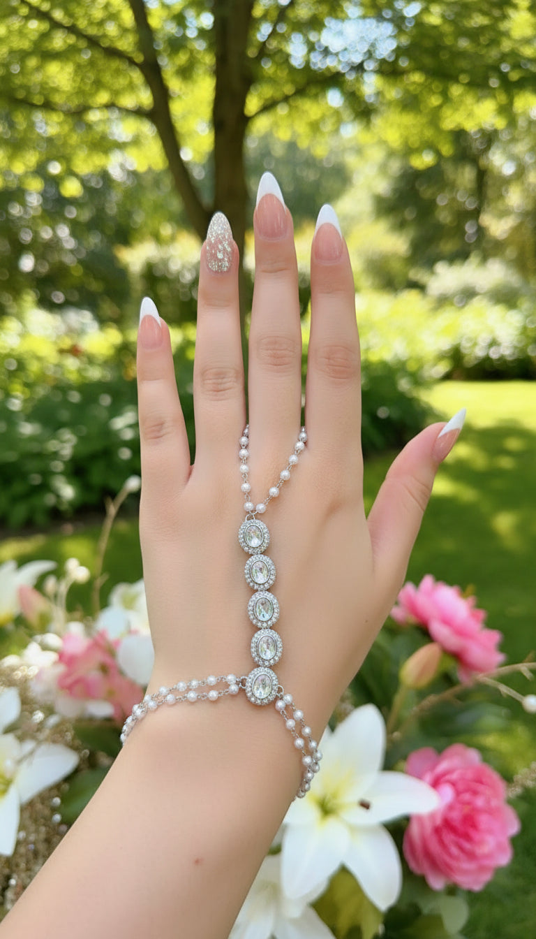 Introducing the Niloufor hand chain, a luxurious and elegant accessory for your hand. This hand bracelet is adorned with rhodium plating, exuding sophistication and exclusivity. Perfect for adding a touch of glamour to any outfit, adjustable ring. Available in Gold and Silver.