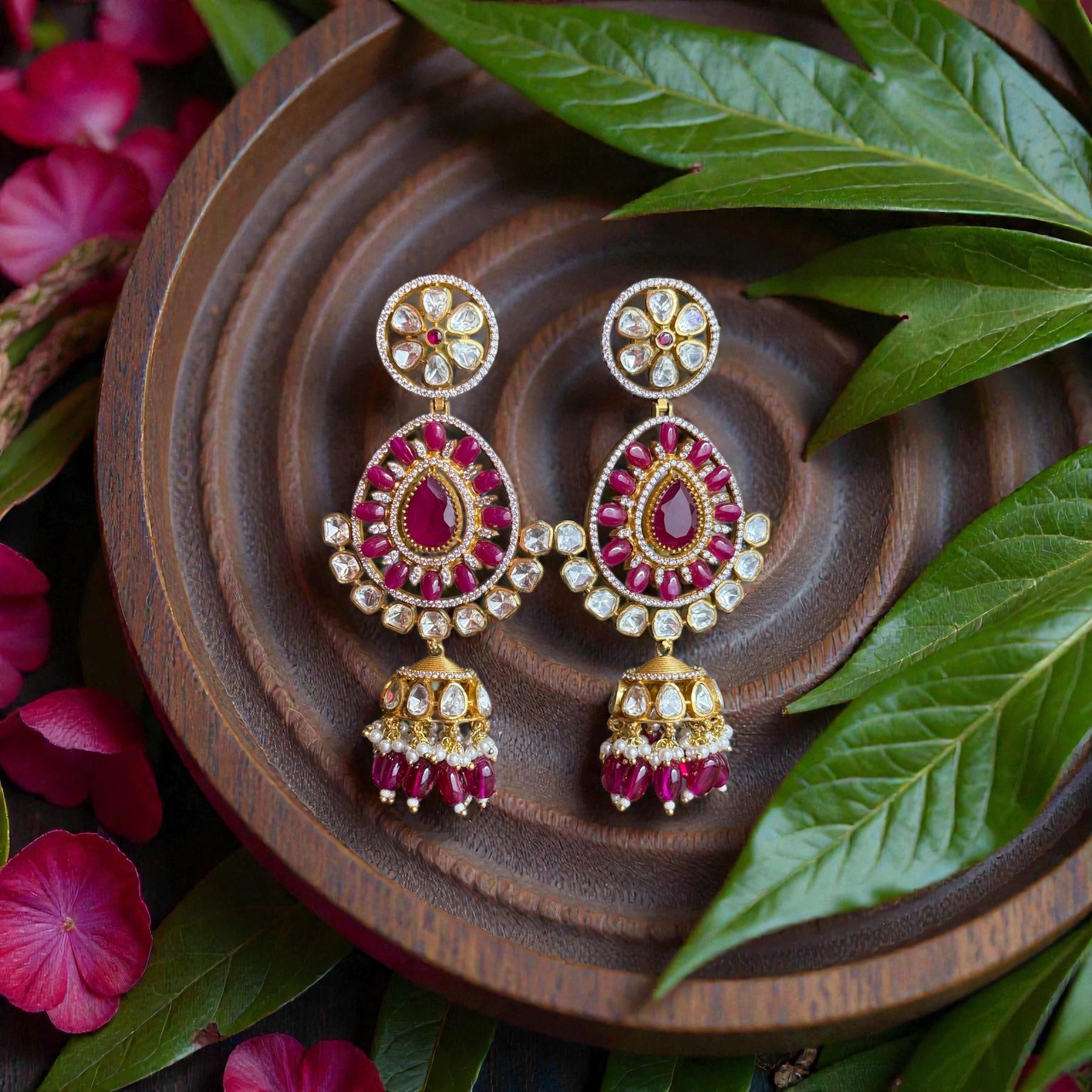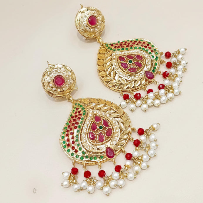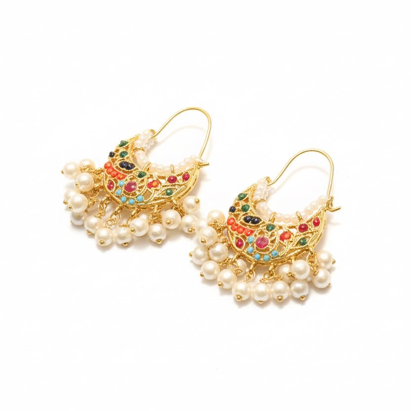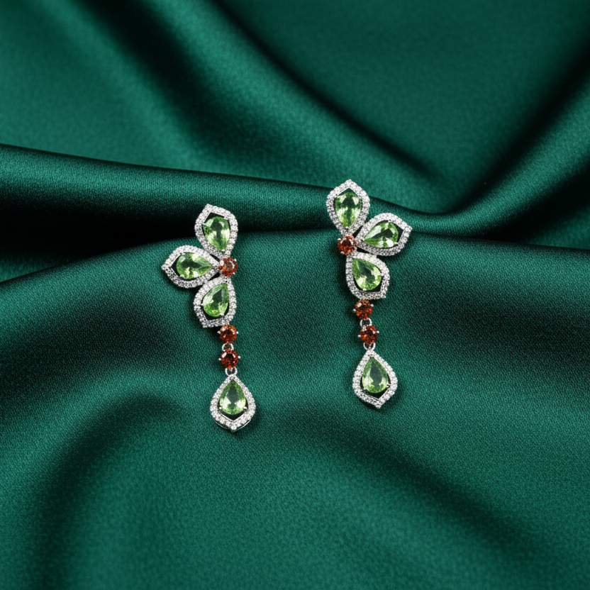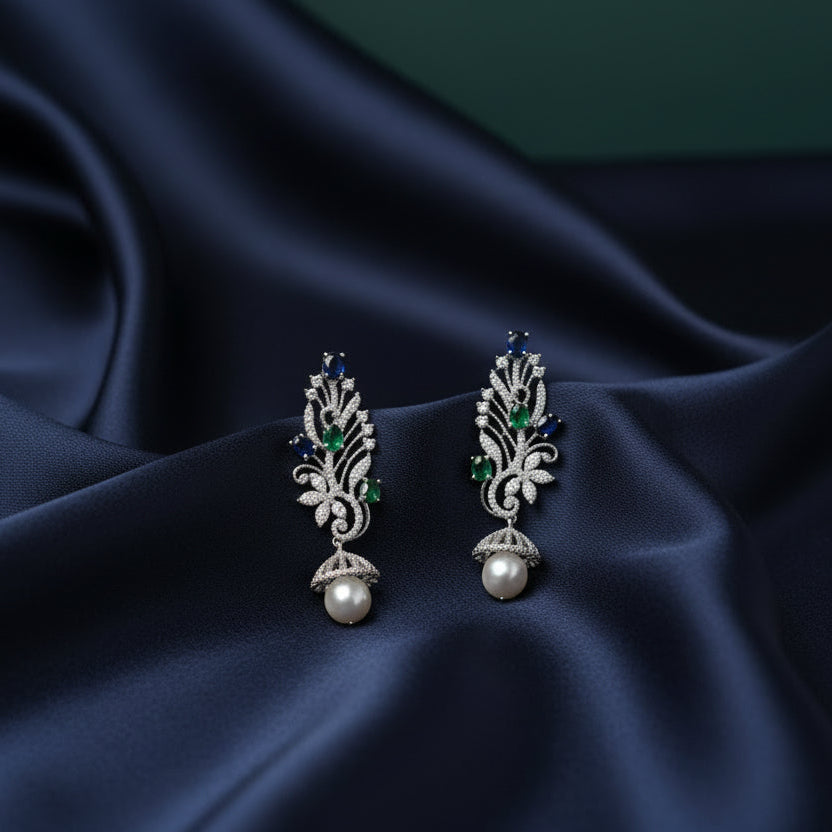 Duniya Earrings showcase carved leaf-shaped cubic zirconia stones in captivating blue and green hues, suspended from rhodium-plated settings. Delicate pearls dangle gracefully from each earring, adding movement and elegance. The rhodium plating provides a bright, tarnish-resistant finish that keeps these earrings looking fresh.