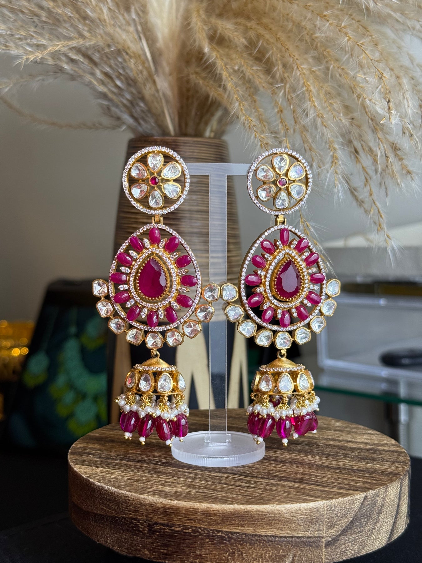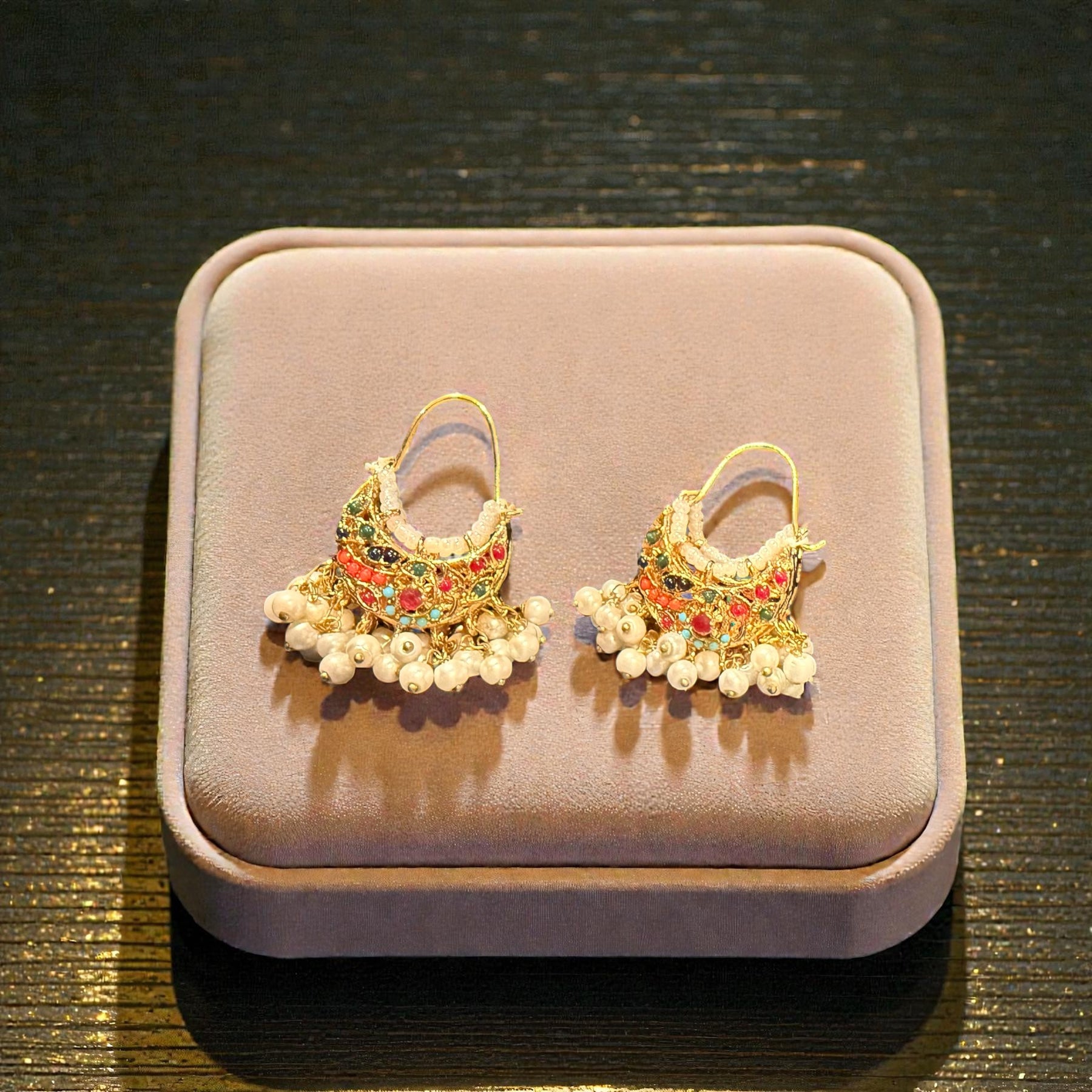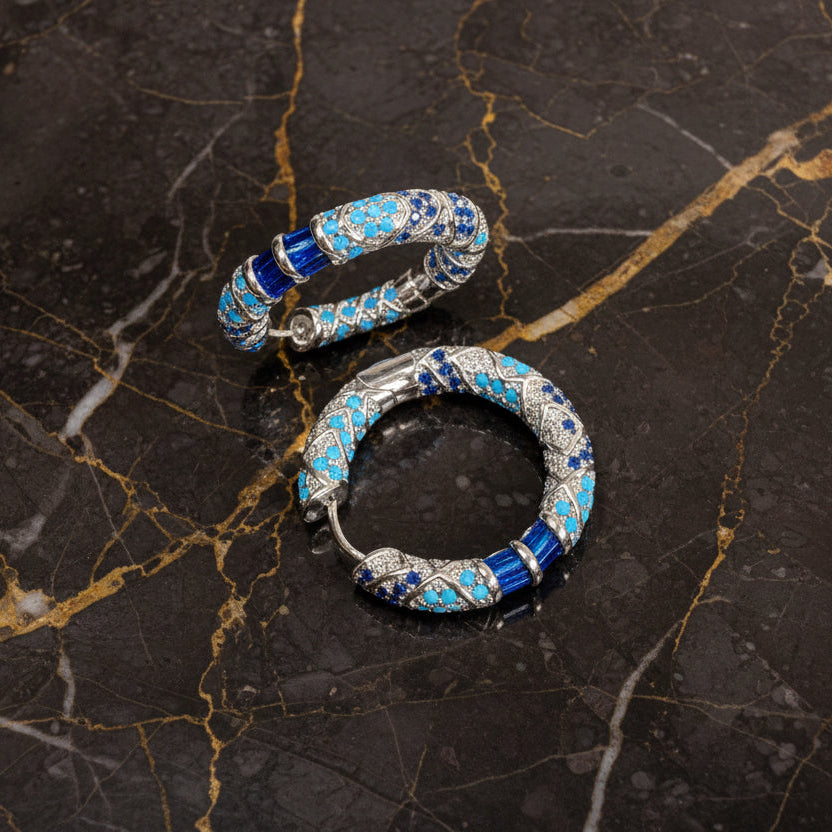 Duniya Earrings showcase carved leaf-shaped cubic zirconia stones in captivating blue and green hues, suspended from rhodium-plated settings. Delicate pearls dangle gracefully from each earring, adding movement and elegance. The rhodium plating provides a bright, tarnish-resistant finish that keeps these earrings looking fresh.