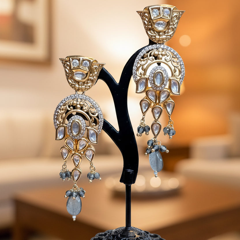 This Jasmine Mala set is perfect for adding a touch of elegance and uniqueness to any outfit. Hand-crafted with high-quality jarau Kundan and featuring a beautiful grey color with gold plating, this set is sure to catch the eye. Stand out from the crowd with this stunning accessory.