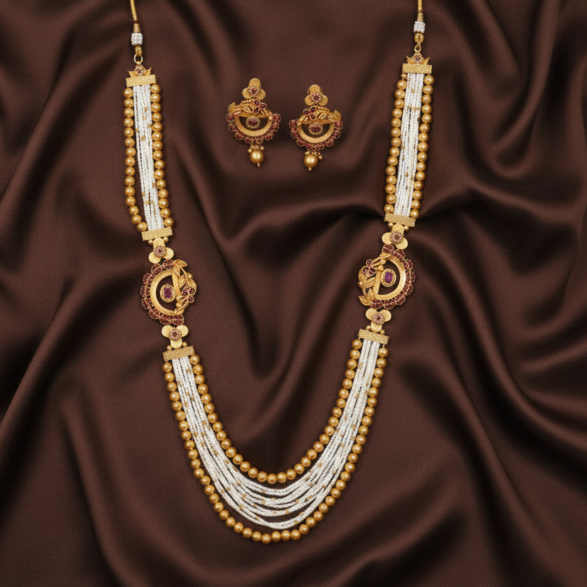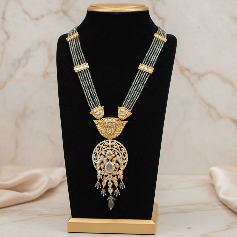 Our Maria long Mala is a stunning piece of Pakistani style jewelry expertly crafted with gold plating. This elegant mala is sure to add a touch of sophistication to any outfit.