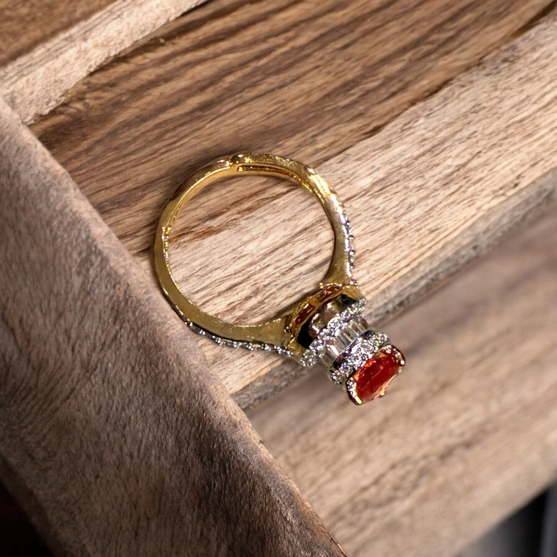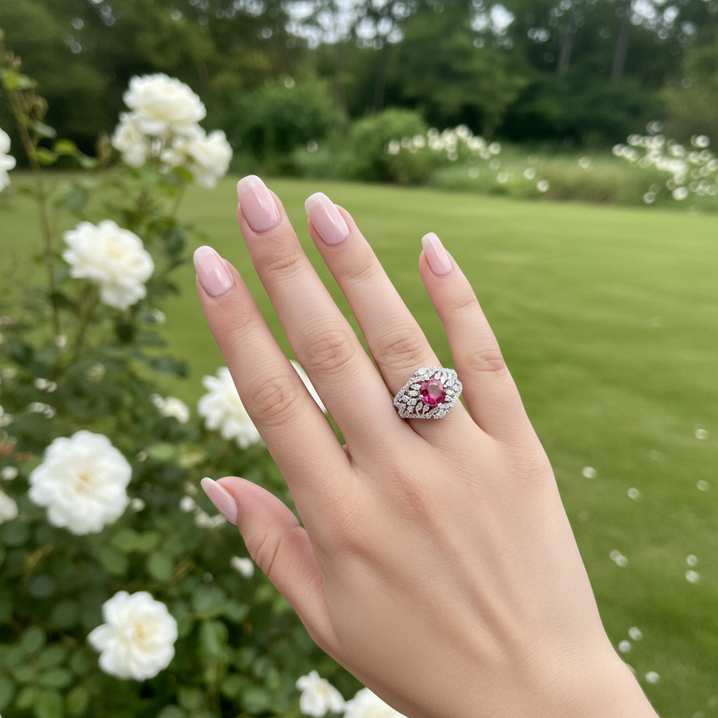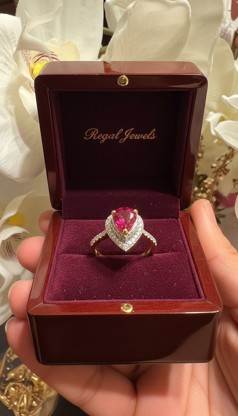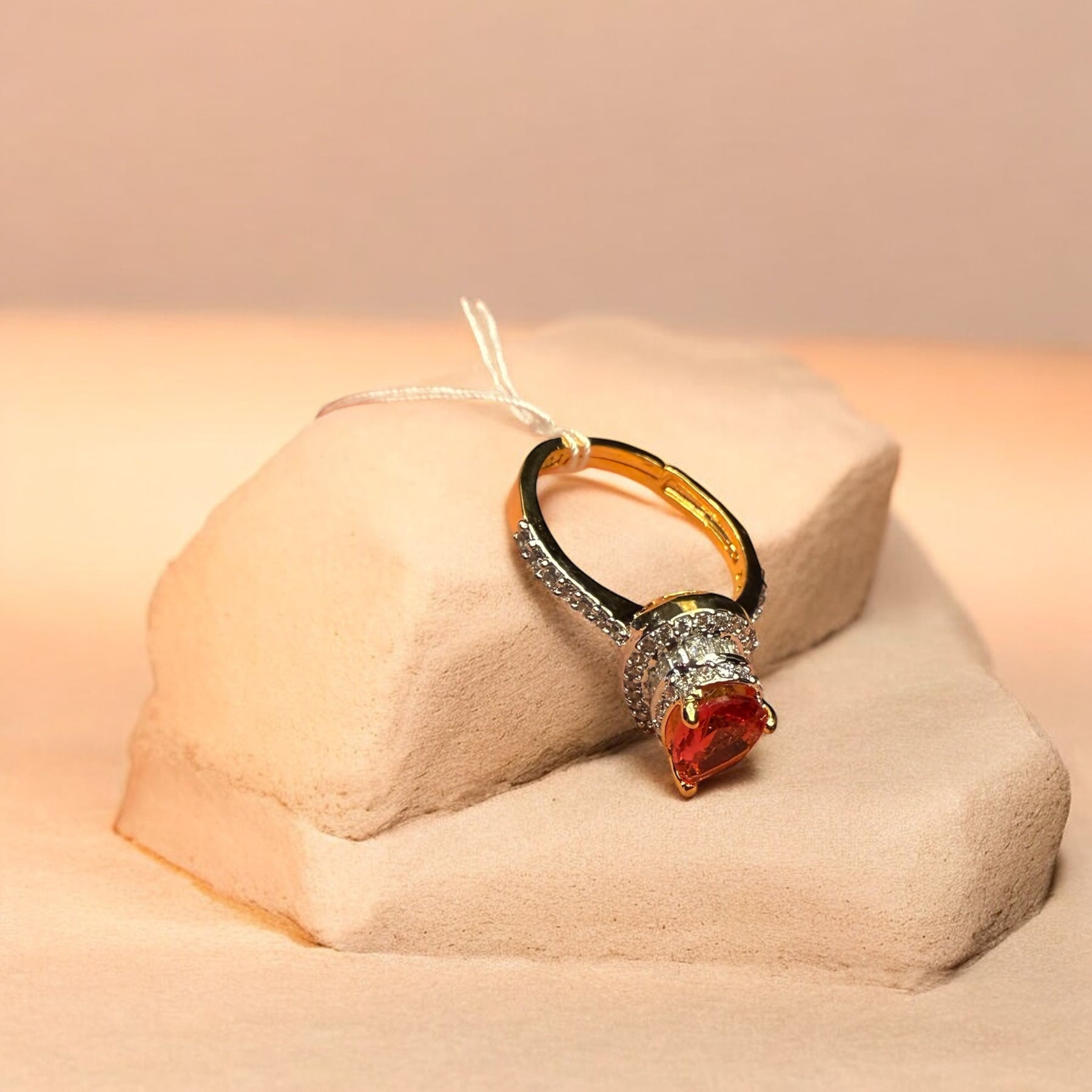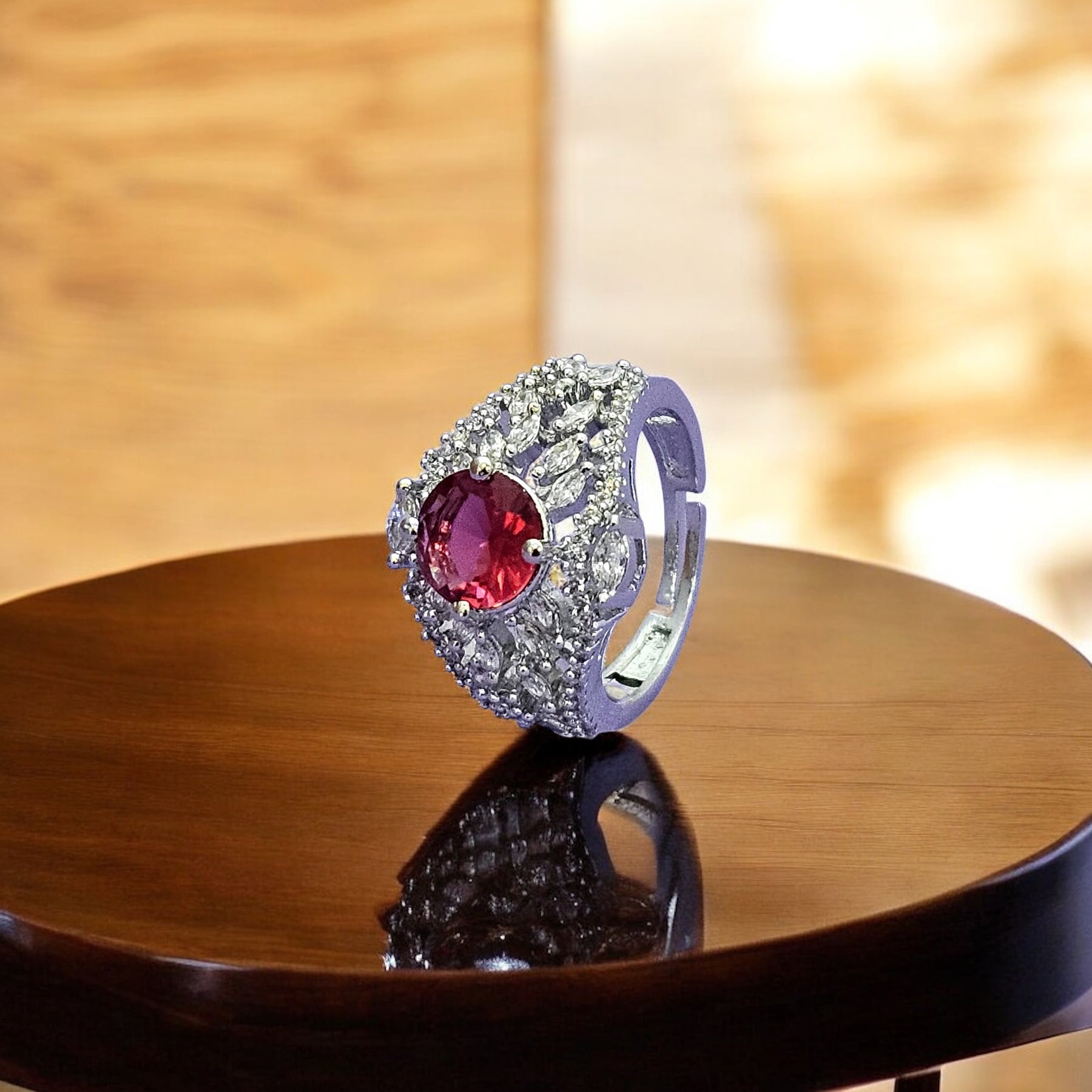 The Sabrina ring offers adjustable size and a beautifully cut Rani red zirconia stone, exuding elegance and sophistication. Experience the luxurious charm of the Sabrina ring..