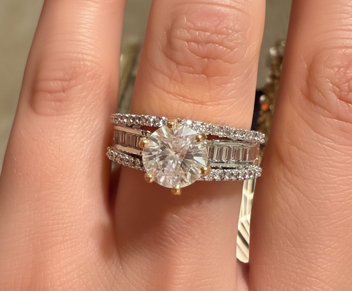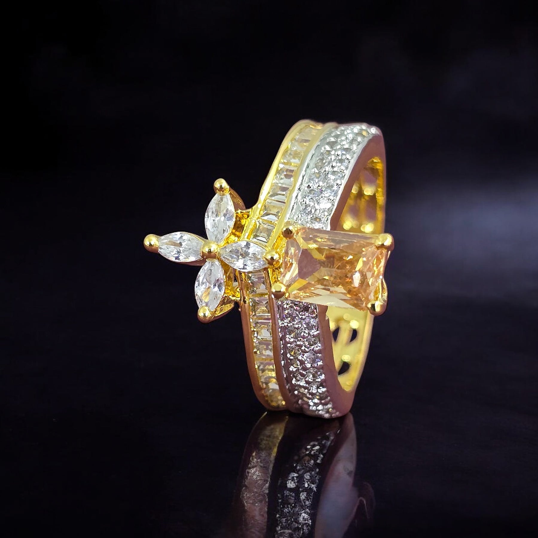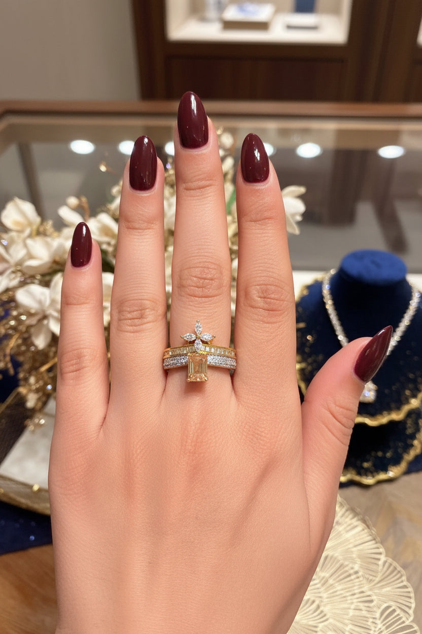 Indulge in the opulent beauty of our Imperial Petal Ring. Expertly crafted with rhodium plating and adorned with a champagne-colored cubic zirconia stone, this adjustable ring exudes luxurious elegance. Its stunning 2-tone design adds a touch of sophistication to any ensemble.