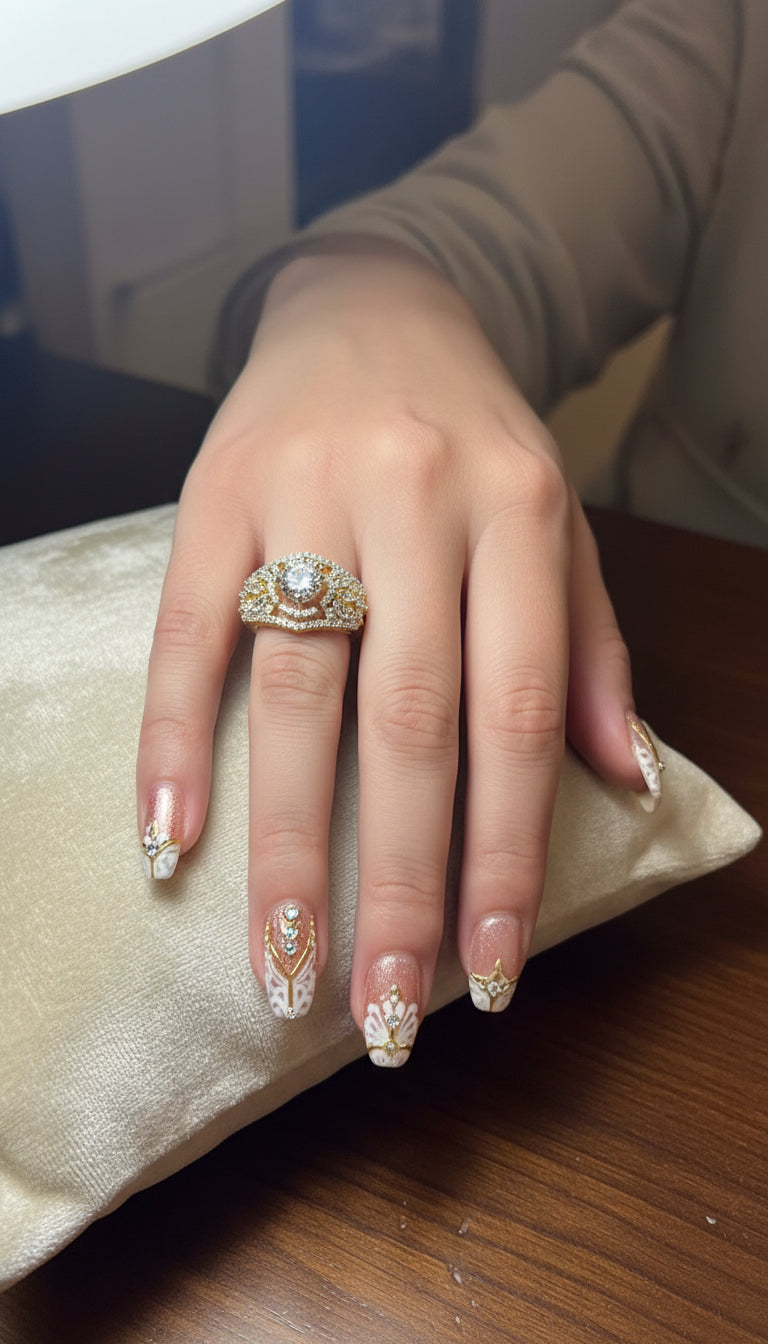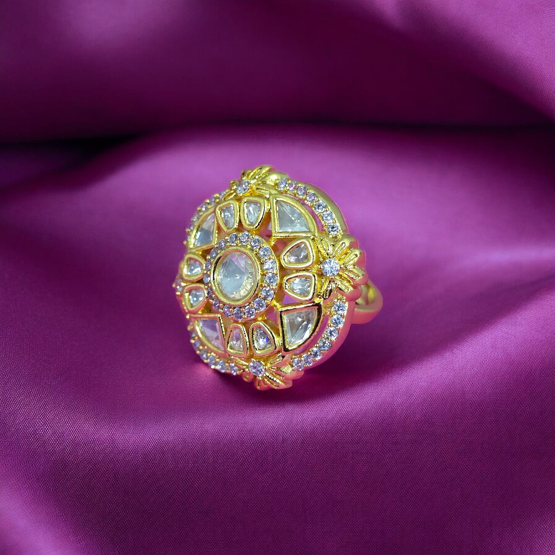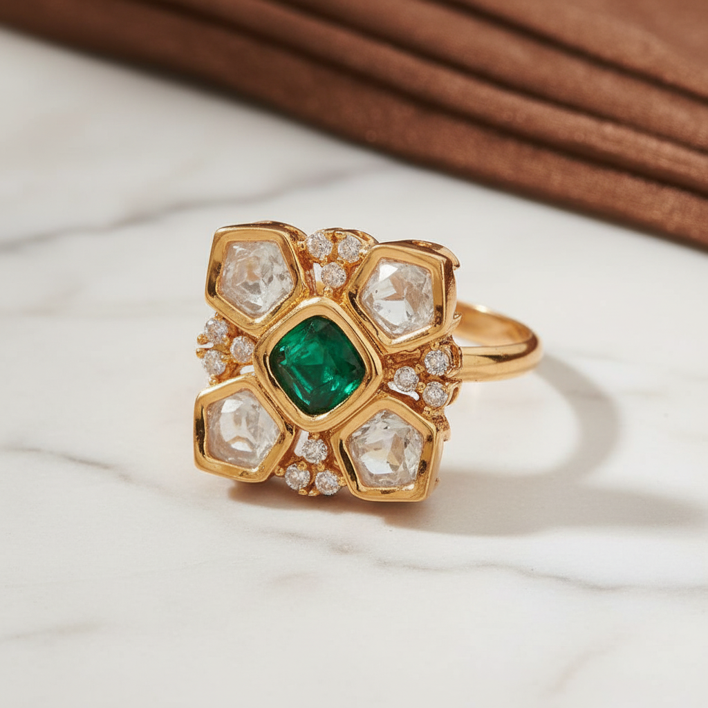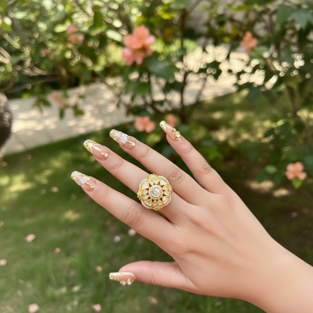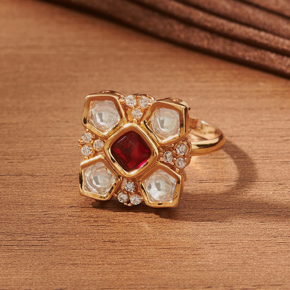 Introducing the Heera Ring - a stunning addition to your jewelry collection. Expertly crafted with Kundan gold plating and adorned with a sparkle of moissonite, this adjustable ring exudes an air of sophistication and luxury..