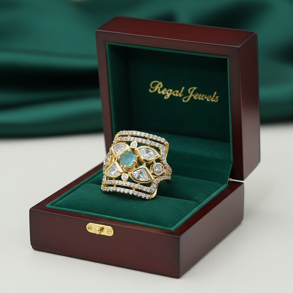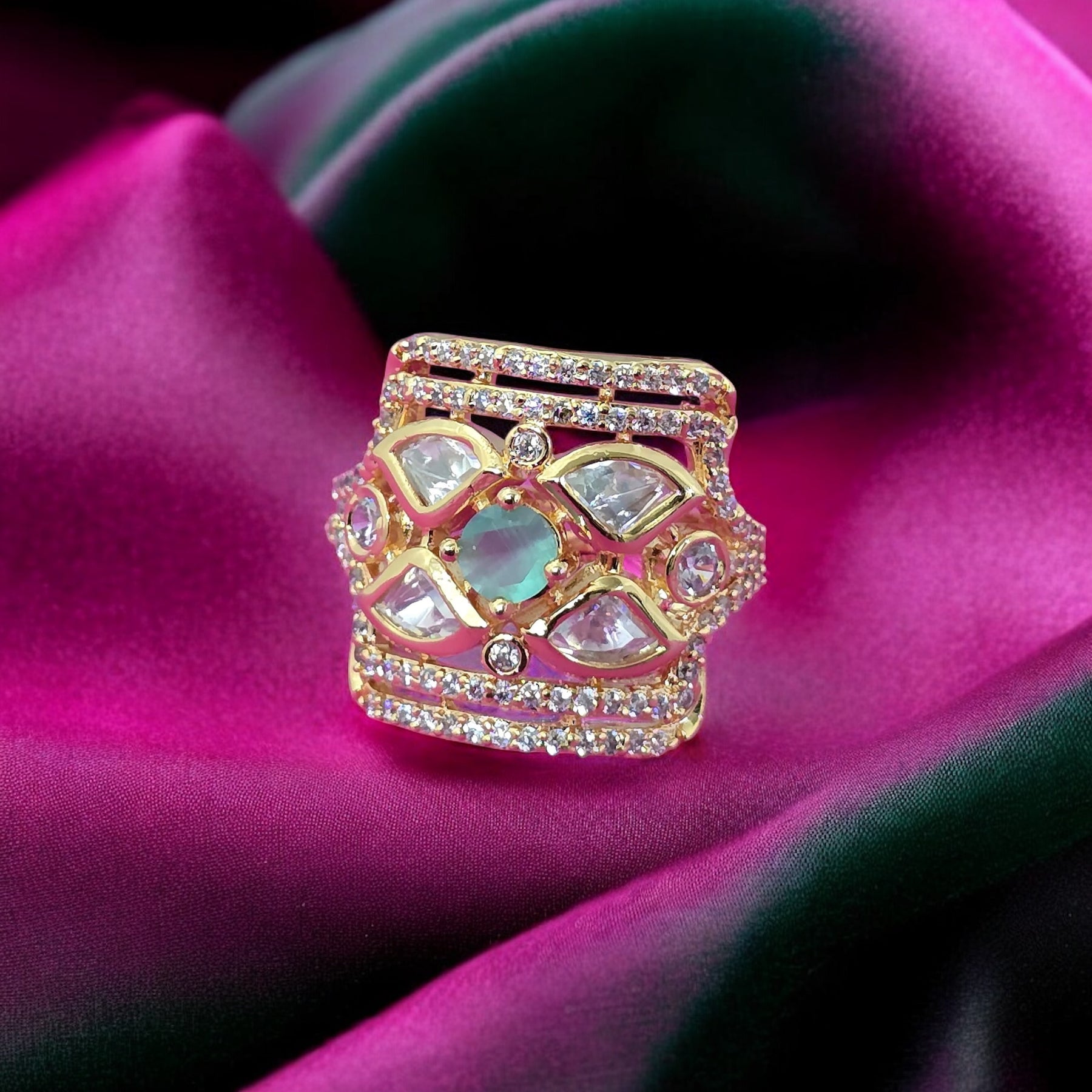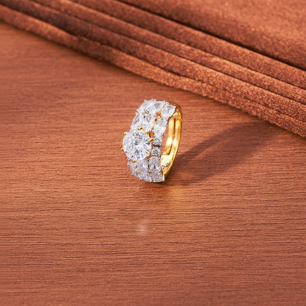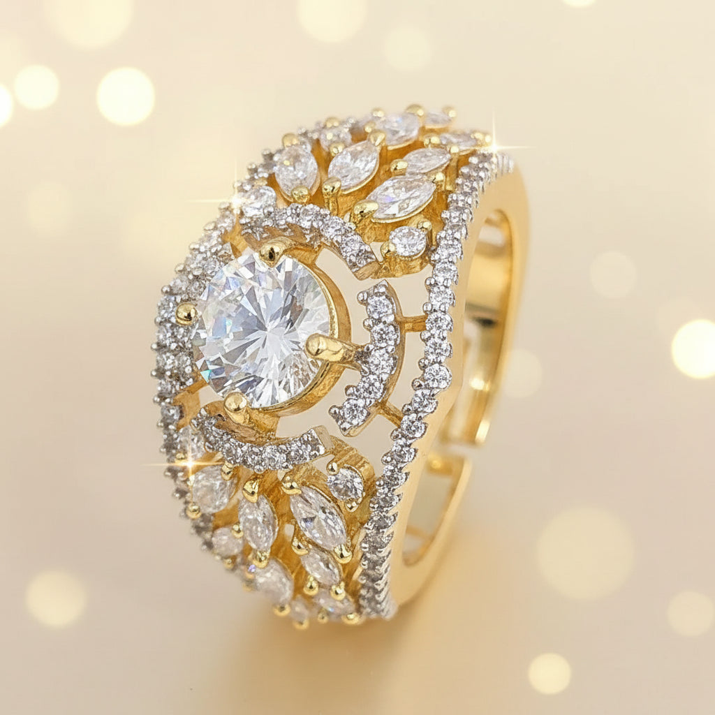 Add a touch of elegance to your style with Diamond Dew, a dazzling cubic zirconia ring in exquisite gold plating. The diamond cut design ensures a luxurious sparkle, while the adjustable fit allows for comfortable wear. Available in White and green colour.