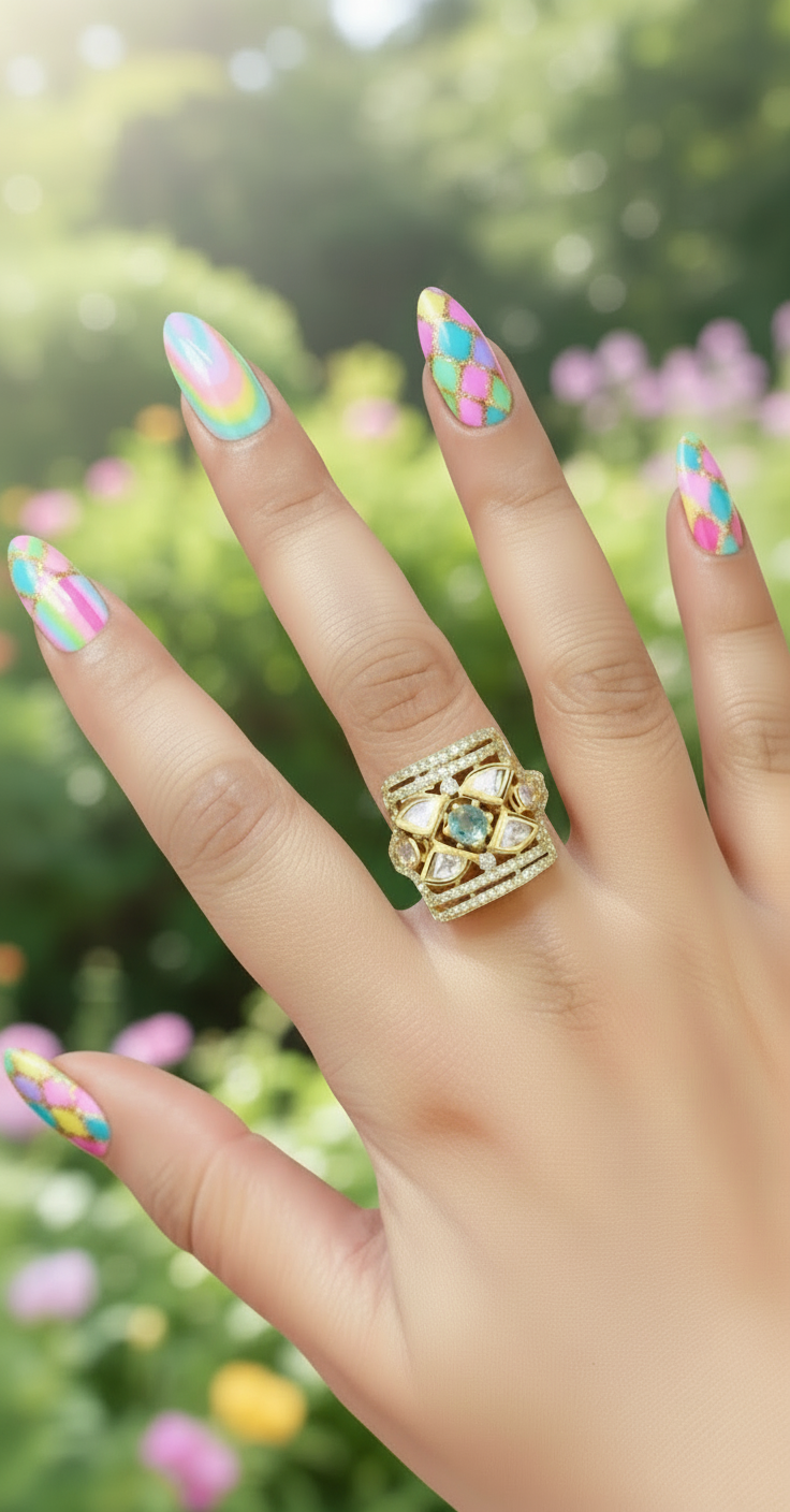 This Sage Ring is a timeless addition to your jewelry collection. Made with Kundan stones and plated in gold, this adjustable ring exudes elegance and sophistication. Perfect for any occasion, it will add a touch of sparkle to your outfit.