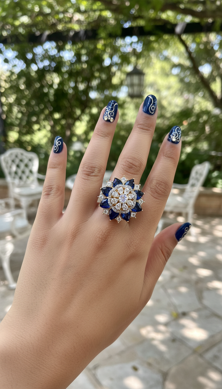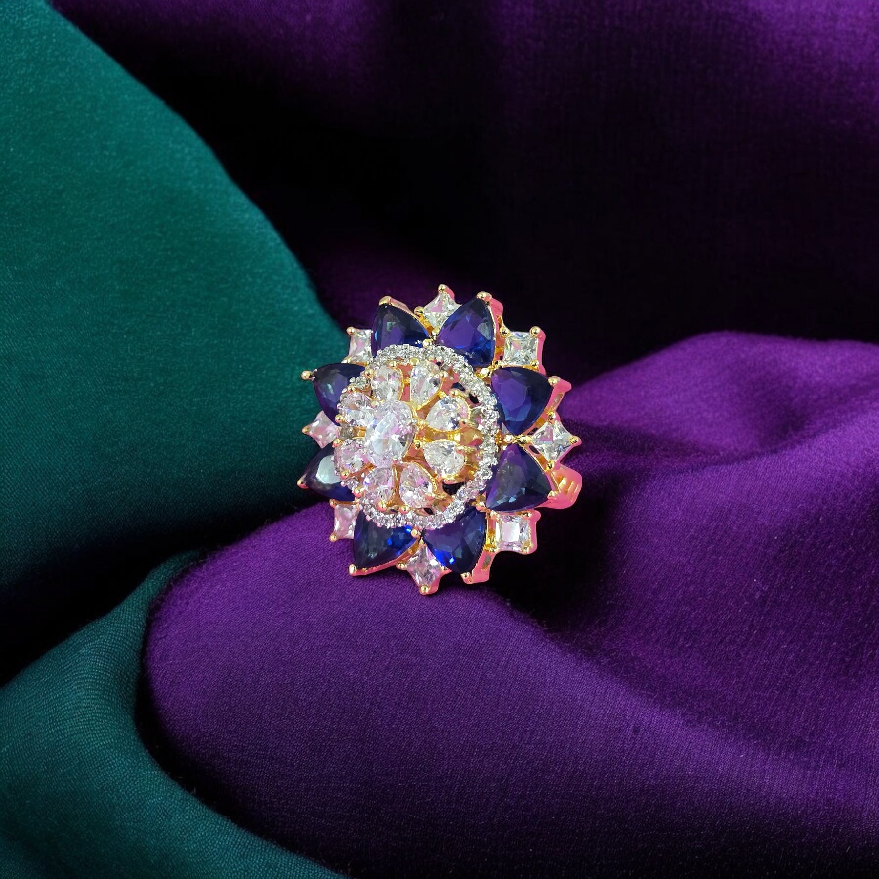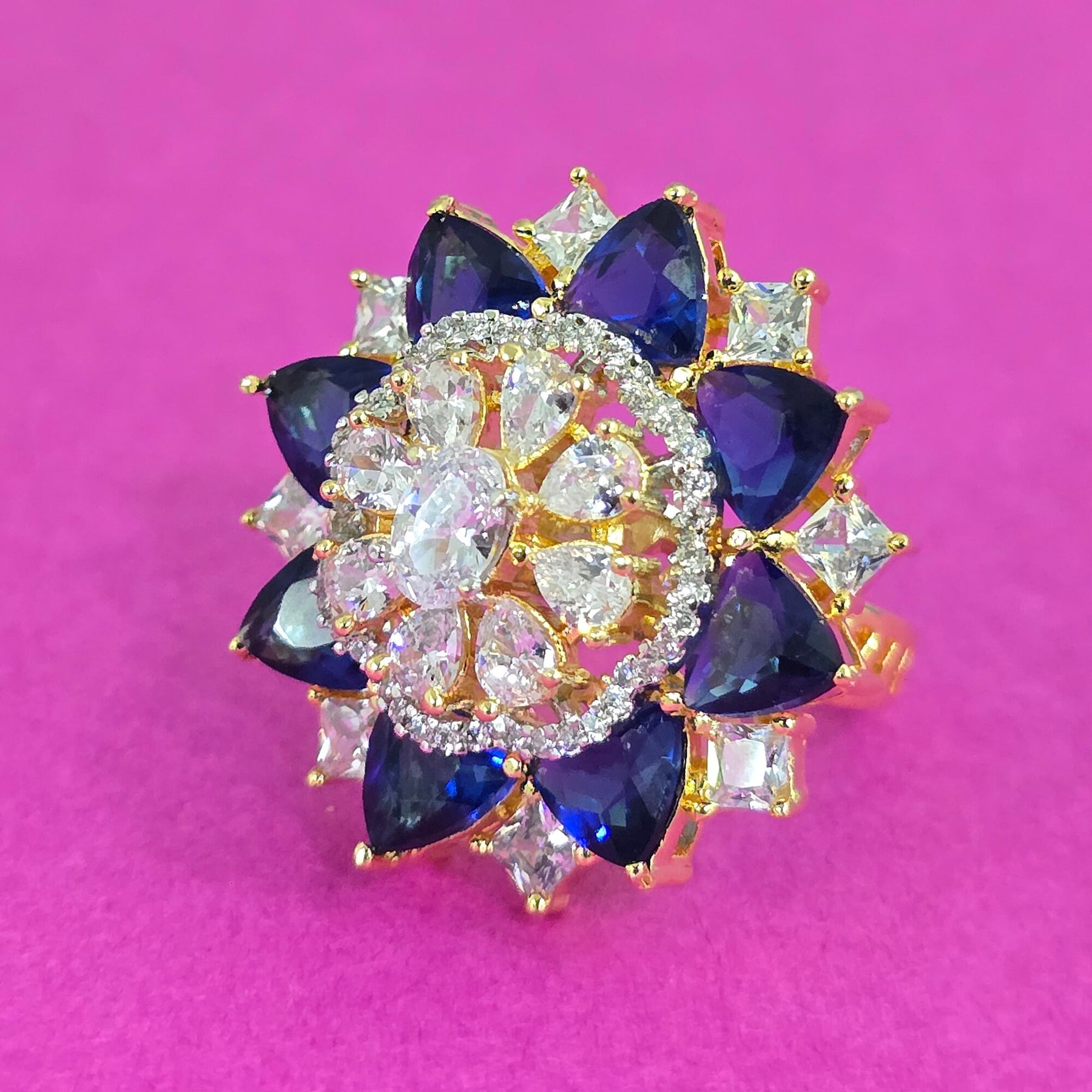 Indulge in luxury with the Riyaasat Ring. Featuring an adjustable design and two-tone color scheme, this statement piece is adorned with cubic zirconia and gold plating. Its sapphire blue stones exude elegance, making it the perfect addition to any outfit.