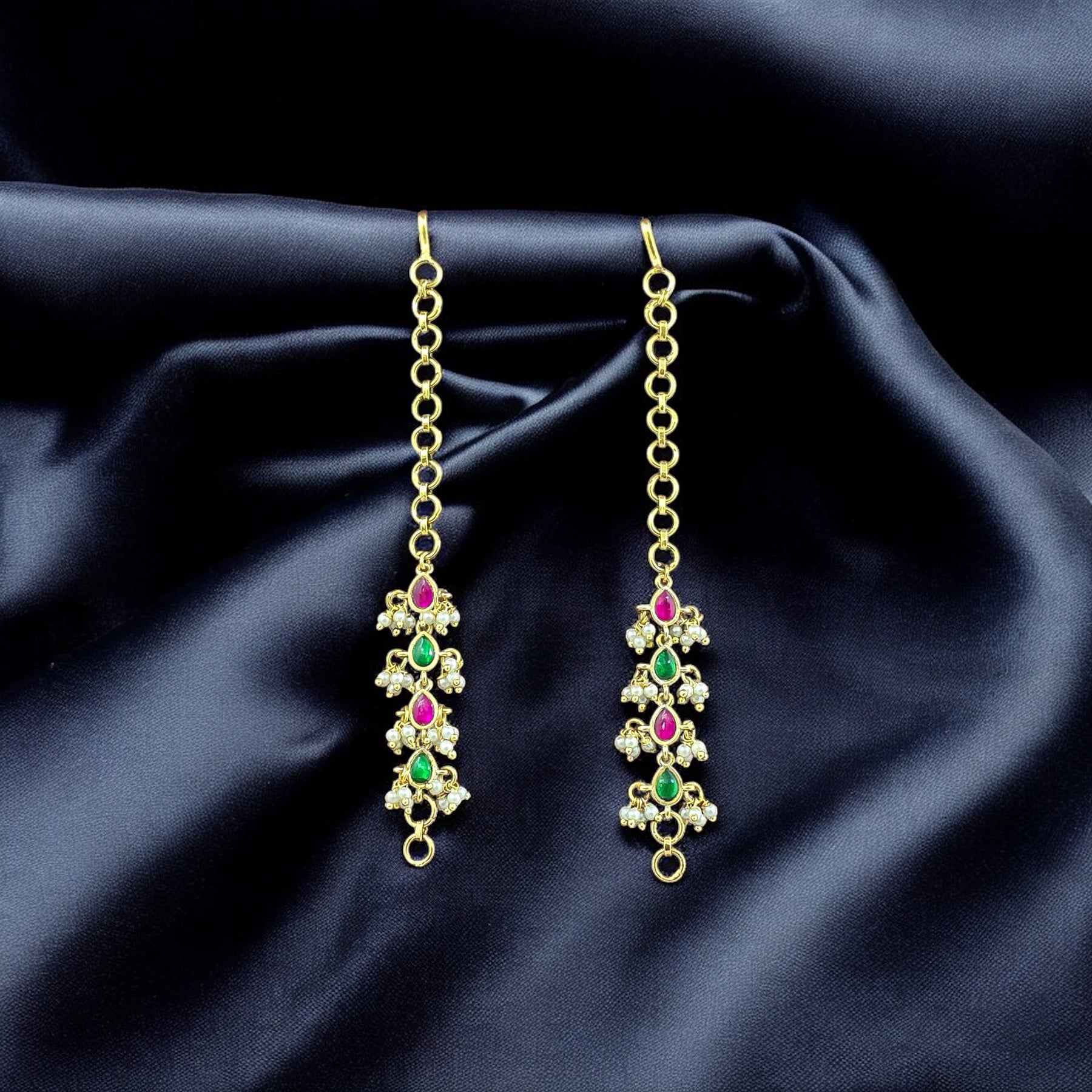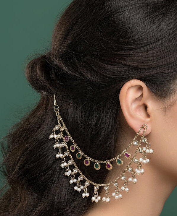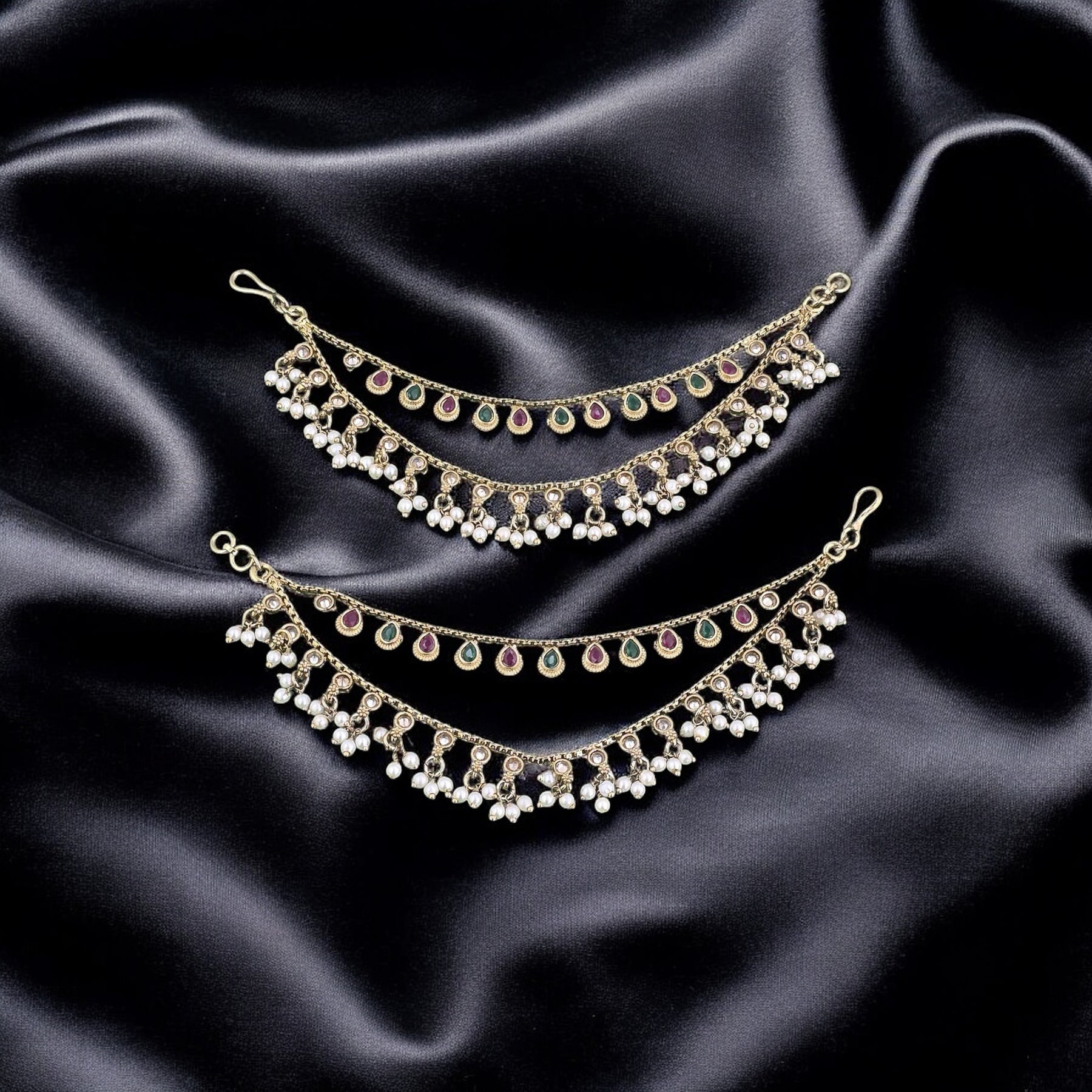 This Antique Moti Earring chain boasts beautiful Mehndi plating, combining traditional and modern styles. The intricate design and high-quality material make it a timeless statement piece. Add them to your favourite Earrings. pair of Sahars (earrings not included)