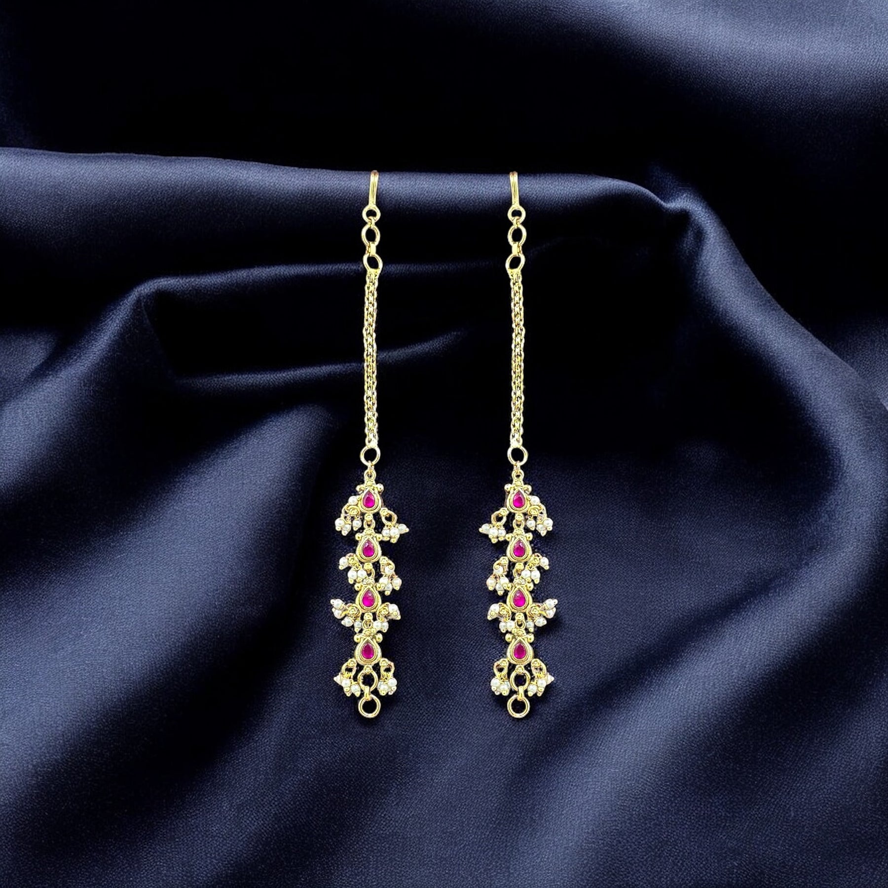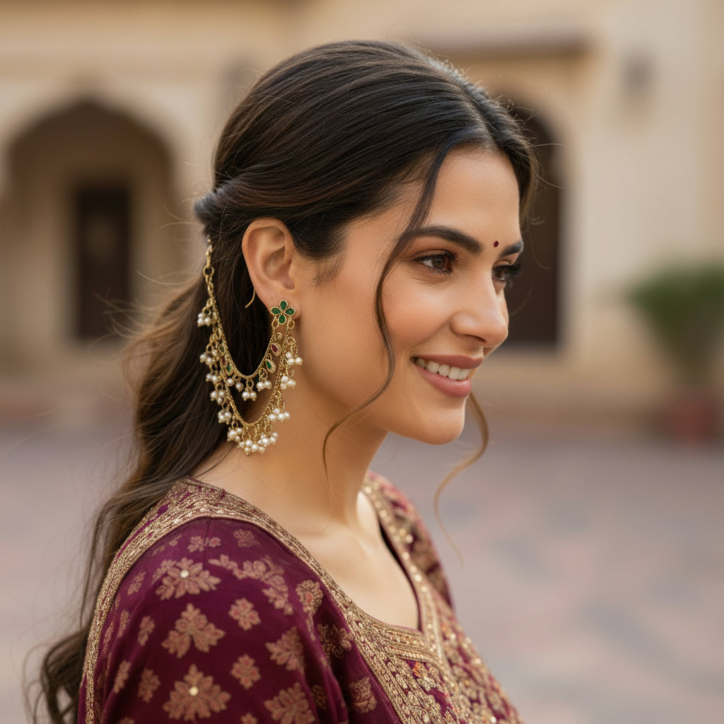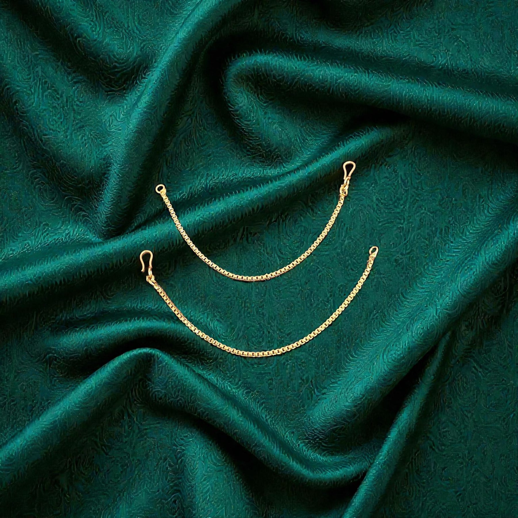 This Antique Moti Earring chain boasts beautiful Mehndi plating, combining traditional and modern styles. The intricate design and high-quality material make it a timeless statement piece. Add them to your favourite Earrings. pair of Sahars (earrings not included)