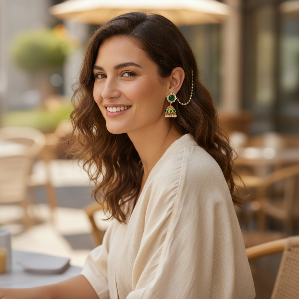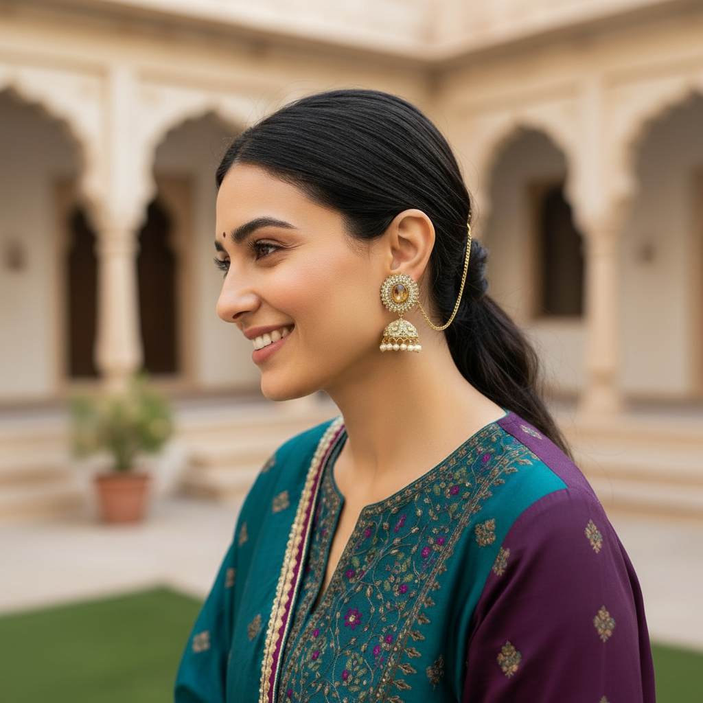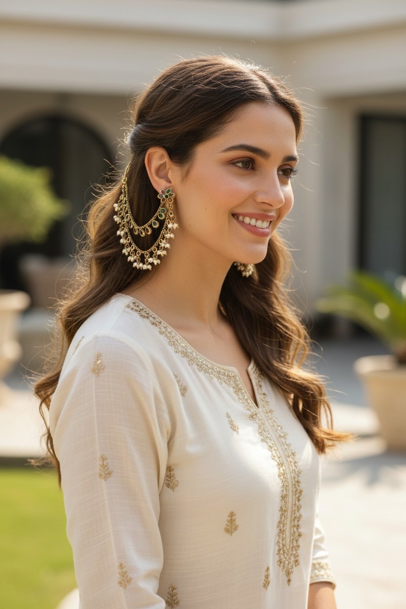 The Noori Sahara Ear Chain adds a touch of elegance to your classic style. Made with Mehndiplating, this ear chain enhances your overall look with a touch of shimmer and shine.